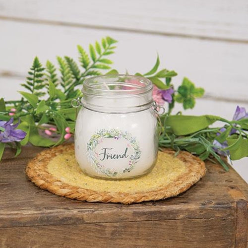 The Jute Cotton Candle Mat is a decorative round tabletop mat made of thick, woven jute material in a braided pattern. The center of the mat is a sunshine yellow color, surrounded by a natural tan border. Display this mat year-round, topped with a candle and candle ring, and placed on a table or countertop space. Measures 6.75" in diameter.