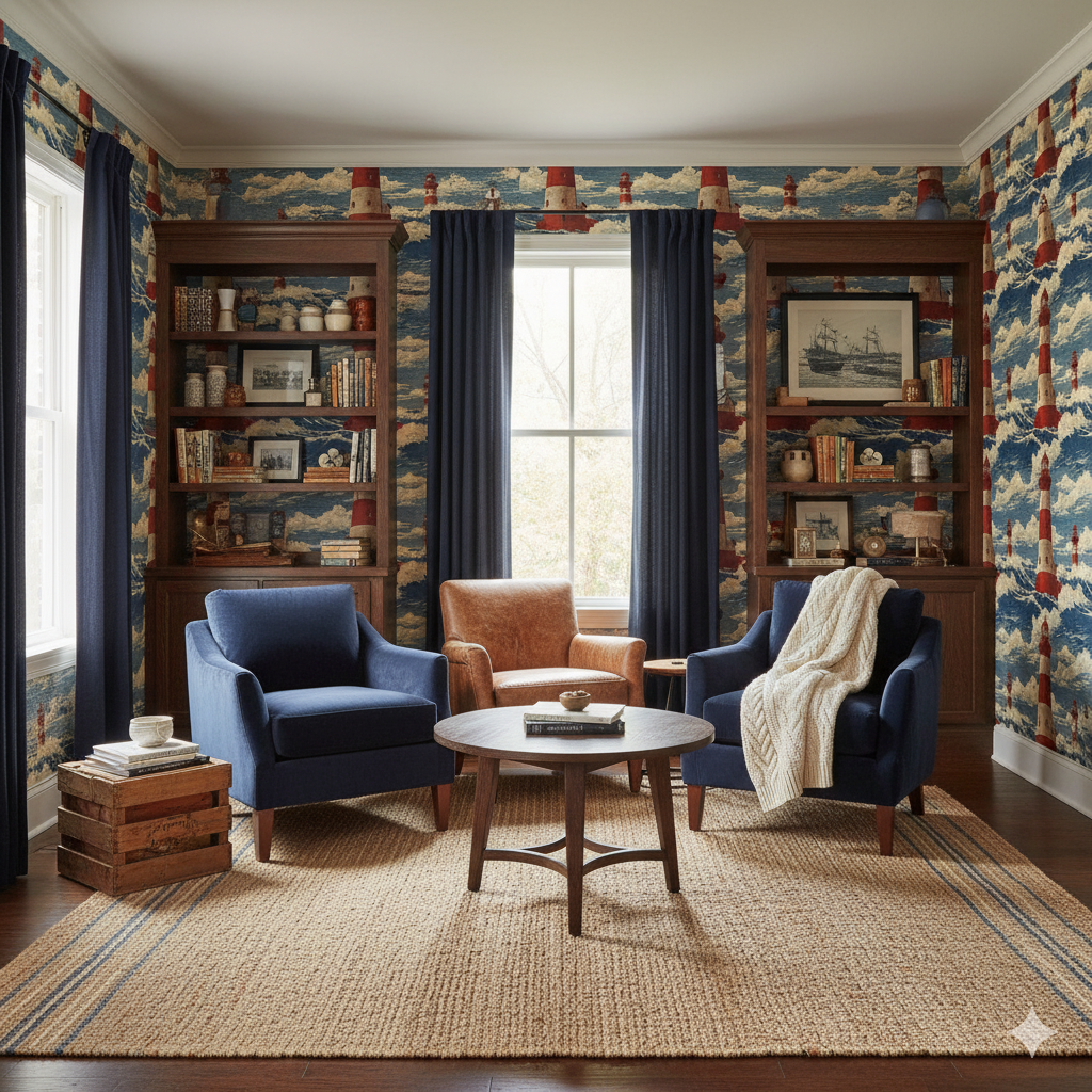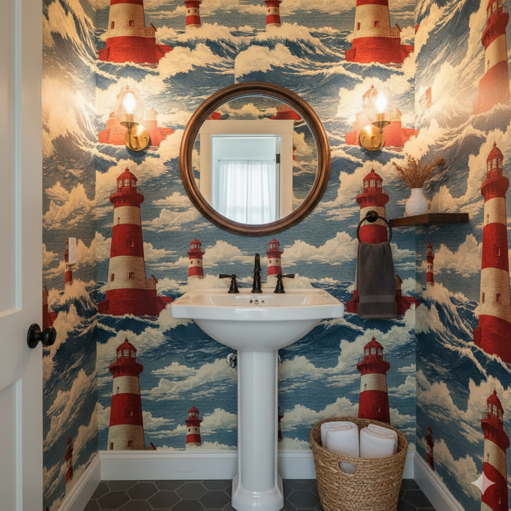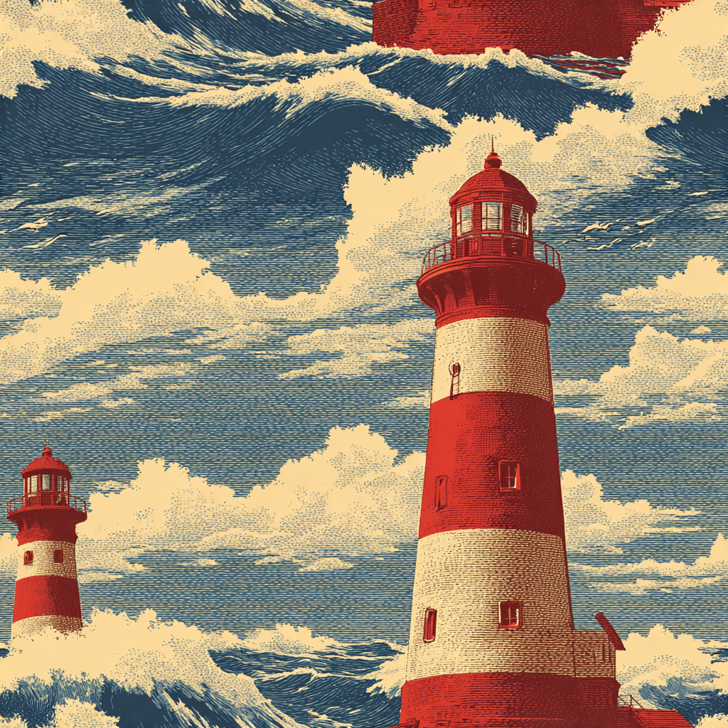 This bold design showcases red-and-white striped lighthouses towering above foaming seas, set against skies filled with scrolling waves and cloud formations. The engraving-like detail and vintage maritime styling lend it the aura of old sailor maps and nautical prints, making it a striking wall covering for coastal cottages, nautical-themed kids’ rooms, or vacation rentals along the shore. Keeper’s Watch is ideal for creating a sense of adventure and history, blending timeless charm with a vivid, storytelling quality that enlivens any wall it covers.