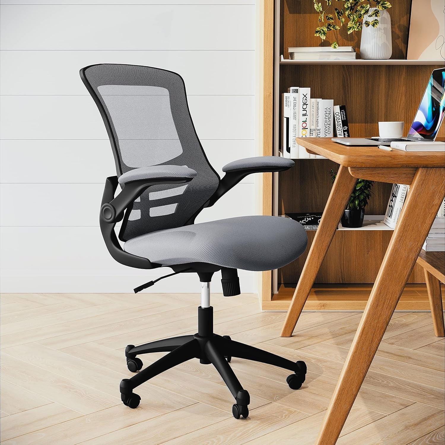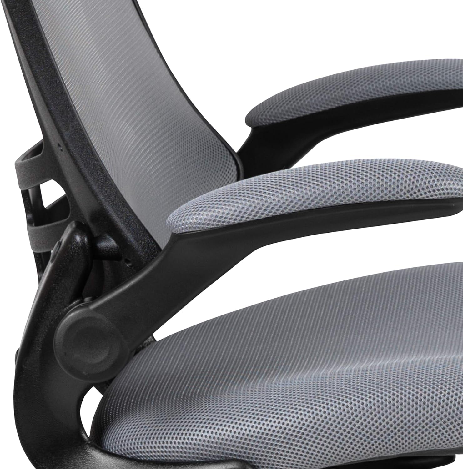- Flip-up arms provide instant space-saving when you need a tighter footprint or want to slide closer to a desk.