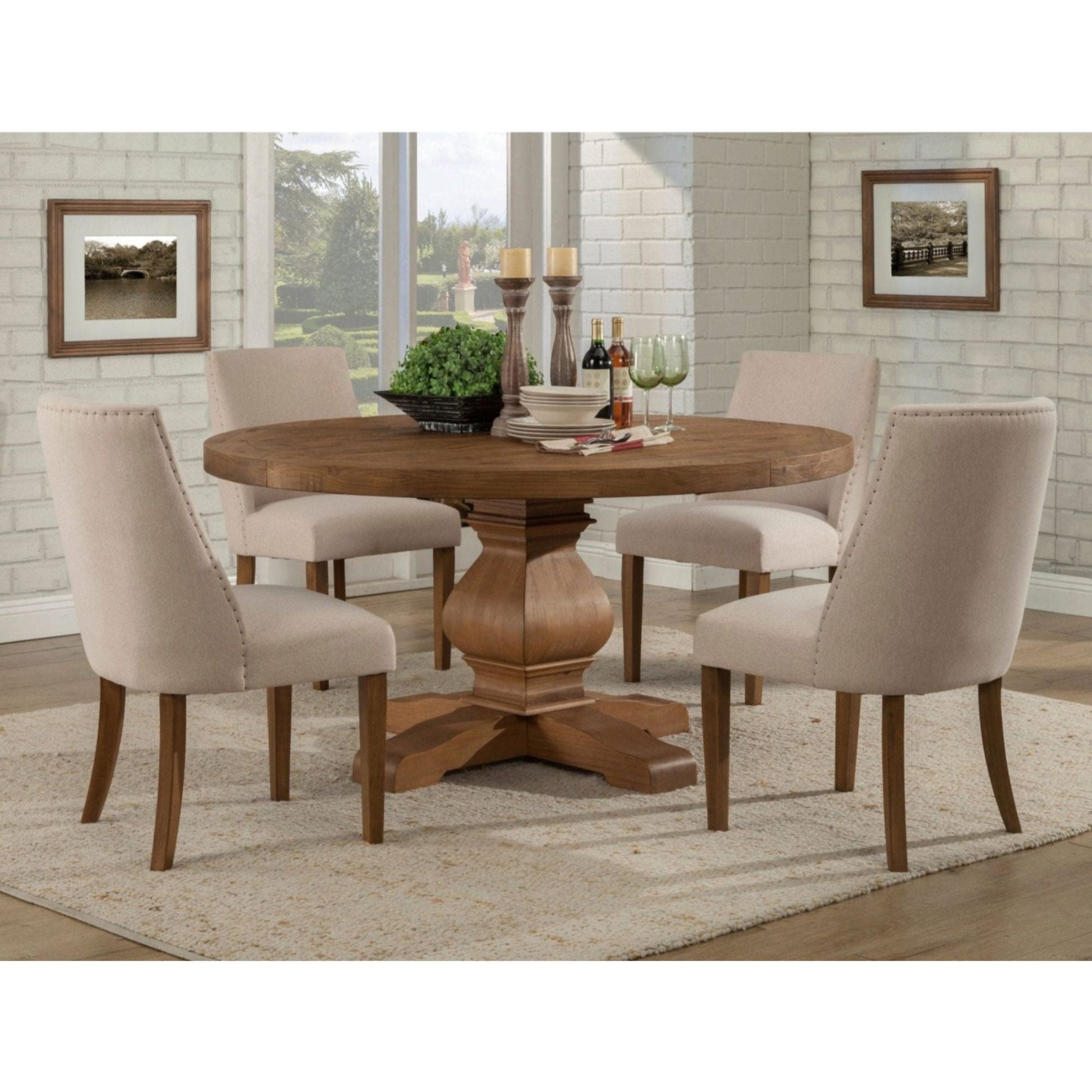 The Kensington round dining table is crafted from solid pine wood. The table showcases a gorgeous pedestal base and boasts a beautiful inlay top. The Reclaimed Natural (brown) finish is warm and casual. Add the 1 drawer/4 door Server and correlating dining chairs to complete the room.
