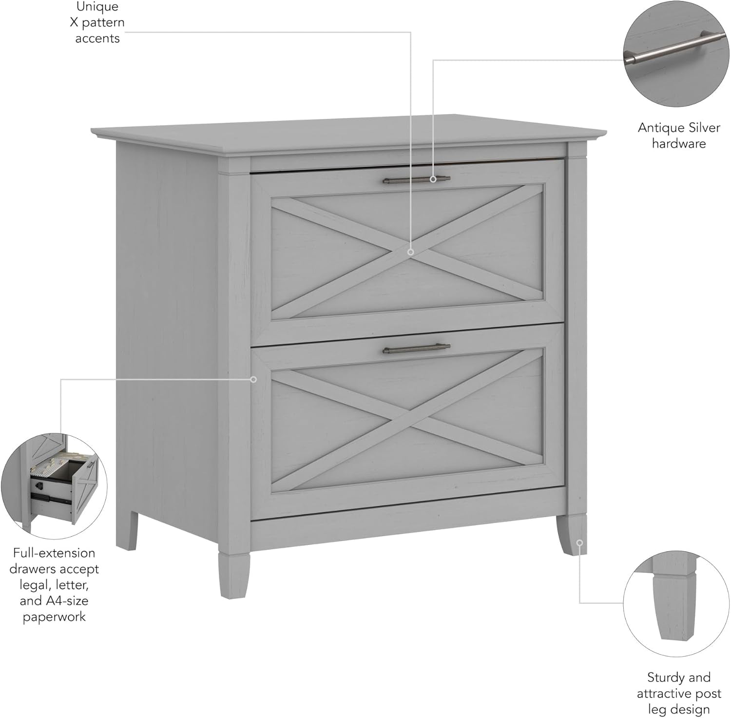 Transform your home office with coastal charm and dependable document storage. The Bush Furniture Key West 2-Drawer Lateral File Cabinet in Cape Cod Gray brings a relaxed, farmhouse-inspired look to your space while keeping papers organized and within reach.
