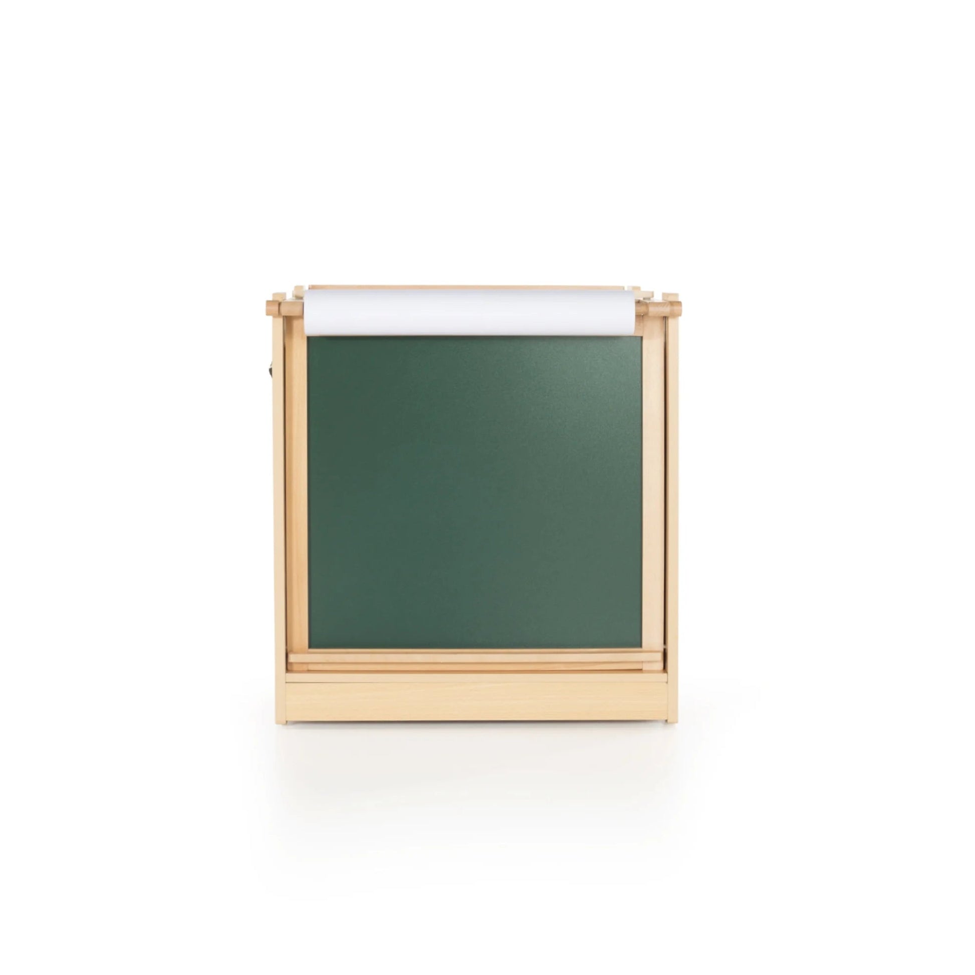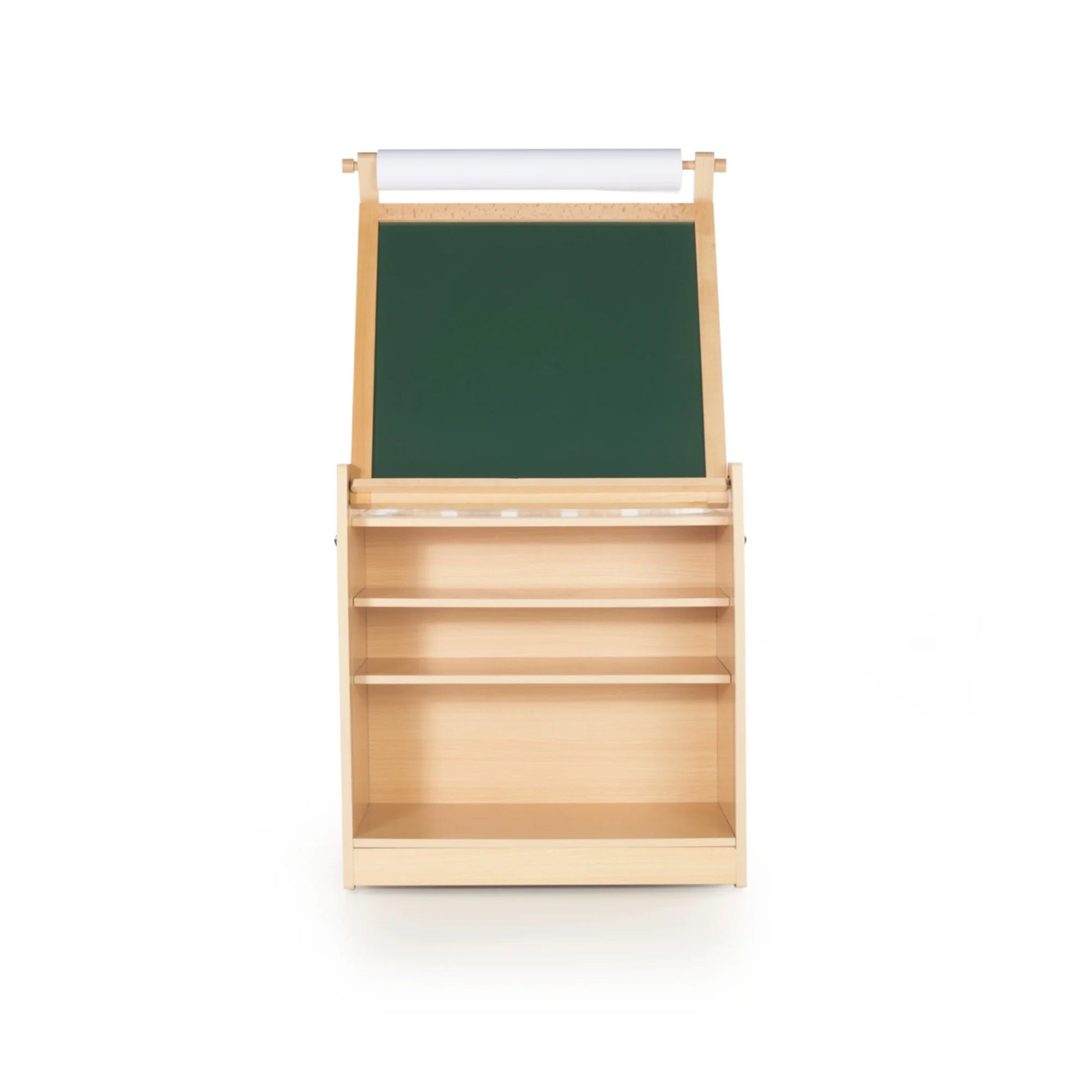 The transformative Desk to Easel Art Cart by Guidecraft is the perfect art space for your budding artist. Easily switch from a flat art desk to an angled drawing station with durable hinges that lock into place. The double-sided easel can be set up as a chalkboard, a write-on/wipe-off board, or used with the included paper roll, allowing multiple artists to work at the same time. Complete with a variety of storage compartments and included fabric bins, this unique art furniture provides the perfect addition to any playroom, home learning environment or classroom. Before use, prime your chalkboard surfaces by liberally covering the entire board with chalk. Rub the chalk in with a dry rag and then erase.