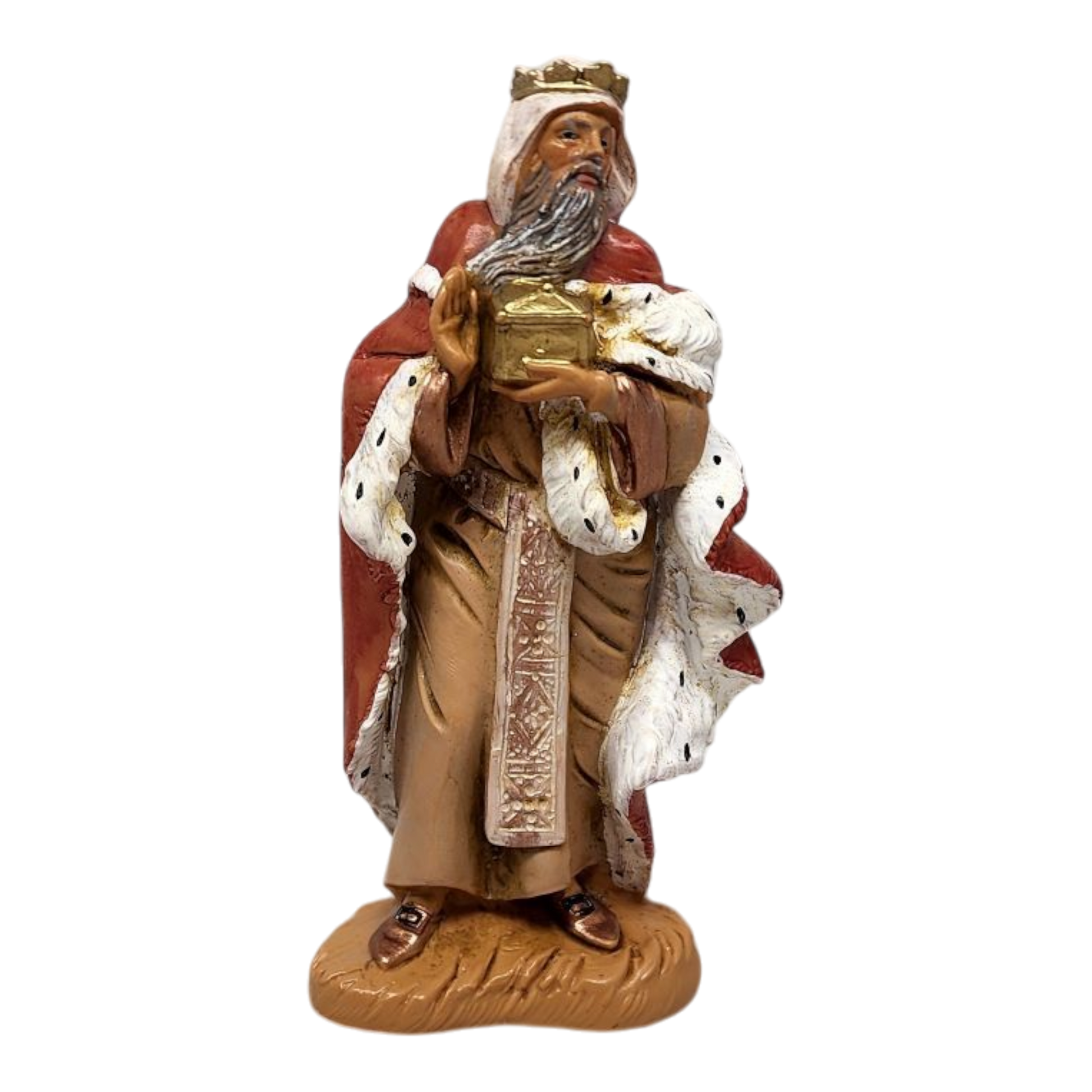Introduce a touch of regal elegance to your nativity scene with our King Melchior figurine, beautifully crafted by Fontanini in Italy. Standing at 5 inches tall, this exquisite piece captures the majestic presence of one of the three wise men as he approaches the stable bearing gifts. Adorned in rich robes with intricate detailing, King Melchior's design is a stunning representation of the significance and grandeur of the nativity story.