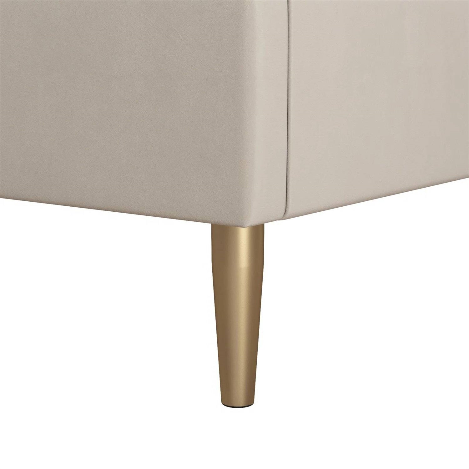 - Designed with tight channel tufting on the headboard and brass-tone tapered metal legs.