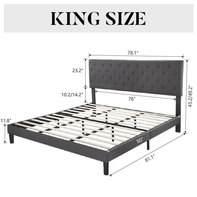 King Size Adjustable Height Grey Linen Tufted Low Profile Platform Bed