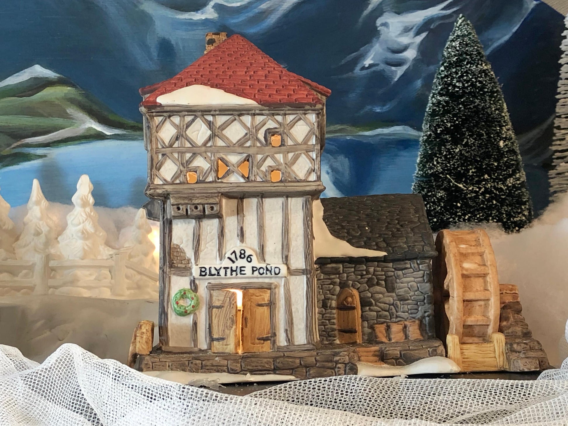 Landgrove Water Mill Porcelain Christmas Village House by O'Well. Santa's Workbench Collection. Holiday Home or Retail Display. Kids Room. Illuminated Hand Painted Porcelain Building. Beautifully Detailed. Gift of Magic. Excellent Condition. Marked by the Manufacturer. The Trees and Accessories are Sold Separately.