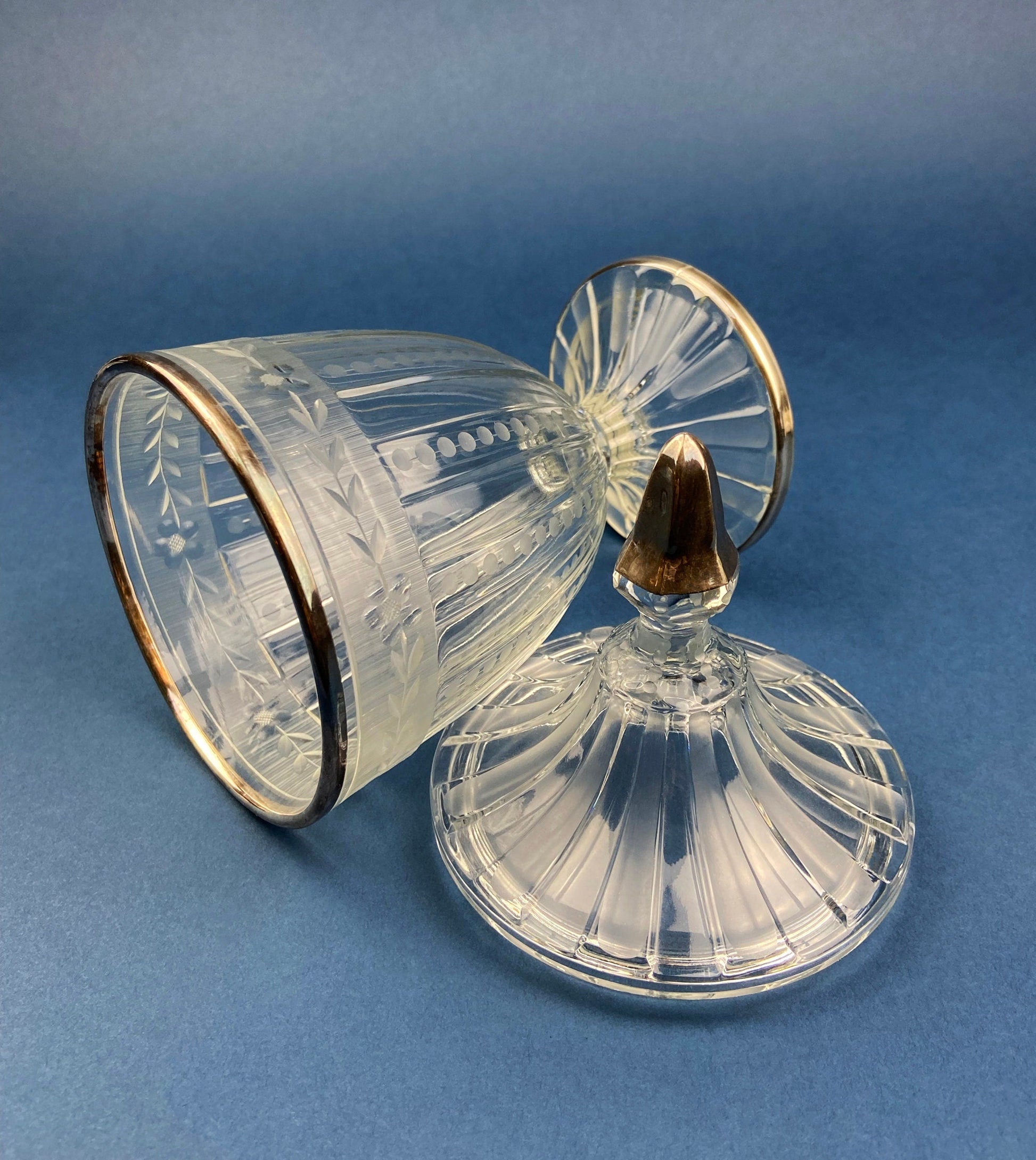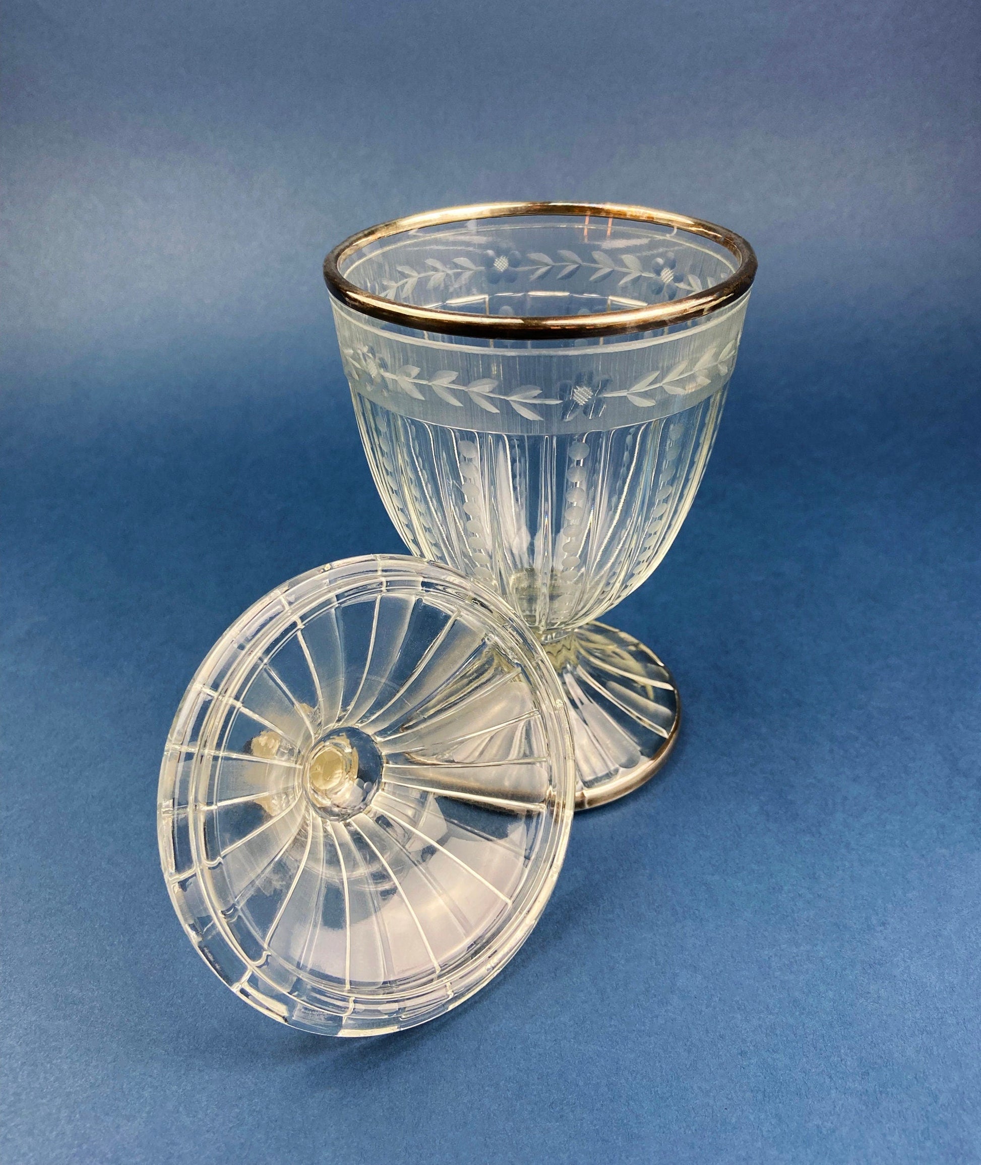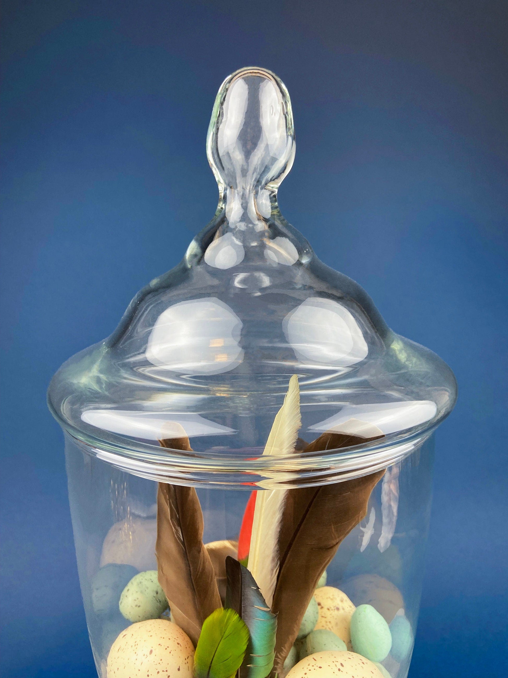 Large Lidded Apothecary with Plastic Eggs and Natural Feathers. Alternative Spring/Easter Decor. Footed, Glass Storage Jar. Terrarium. Table Centerpiece. Shabby Chic Decor. Excellent Condition.