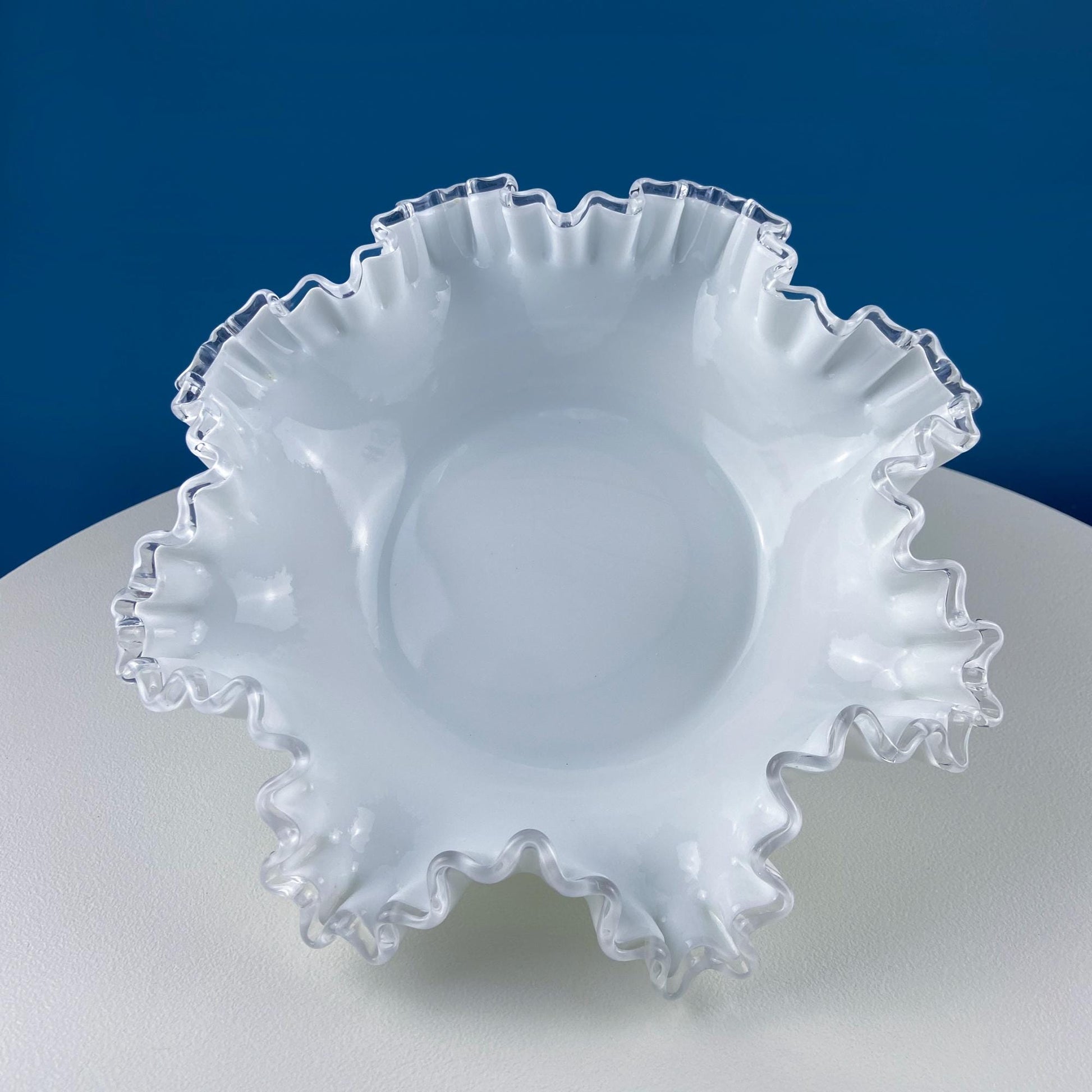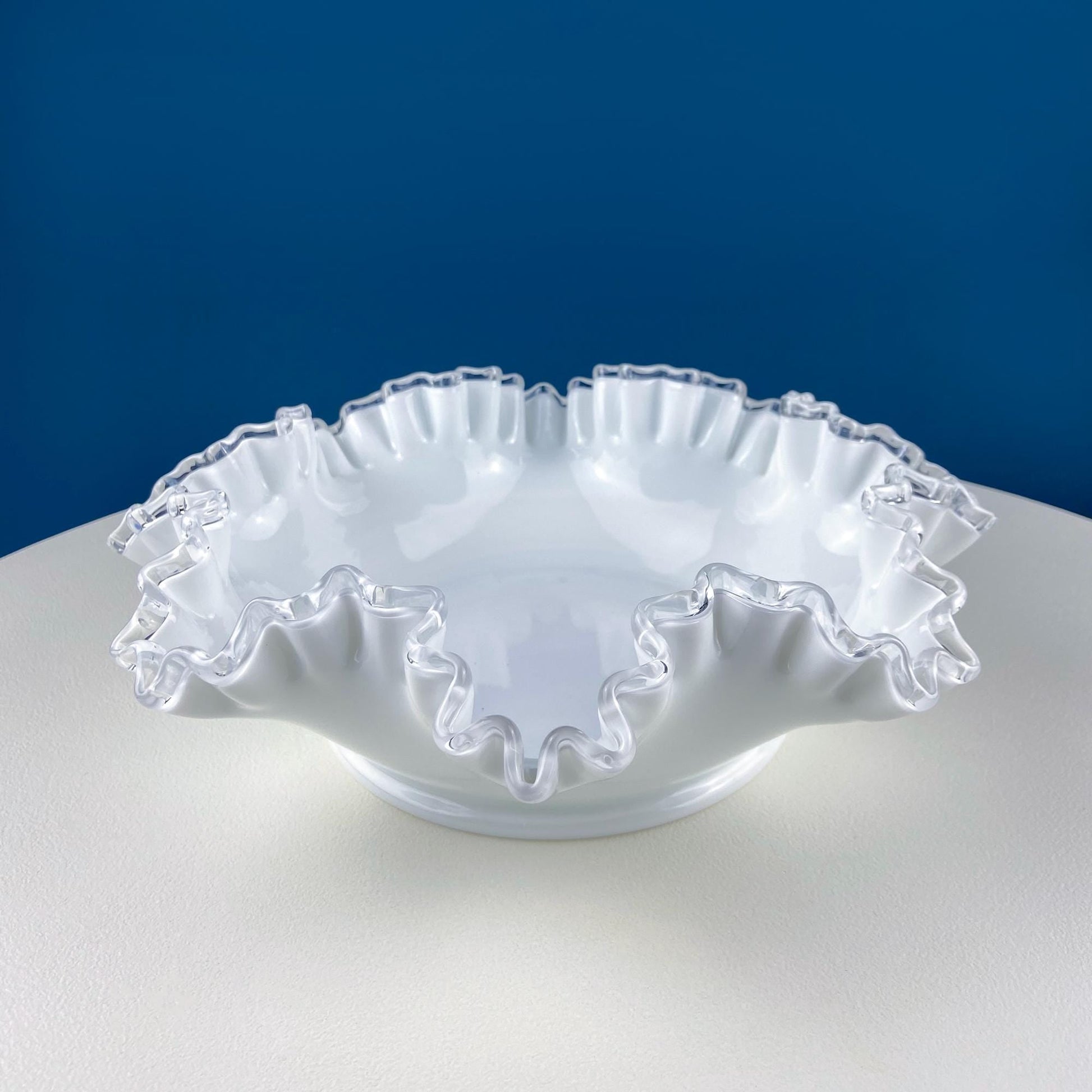 Large Silvercrest Bowl with Ruffled Edge. White Glass Fruit Bowl or Serving Dish with Clear Brim. Table Centerpiece. Wedding Gift.