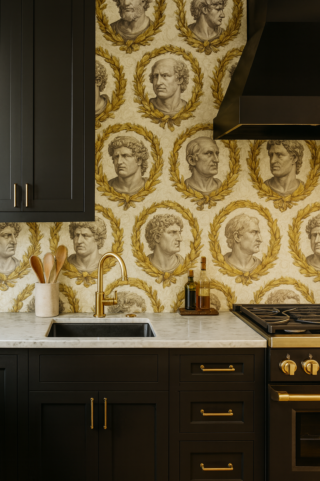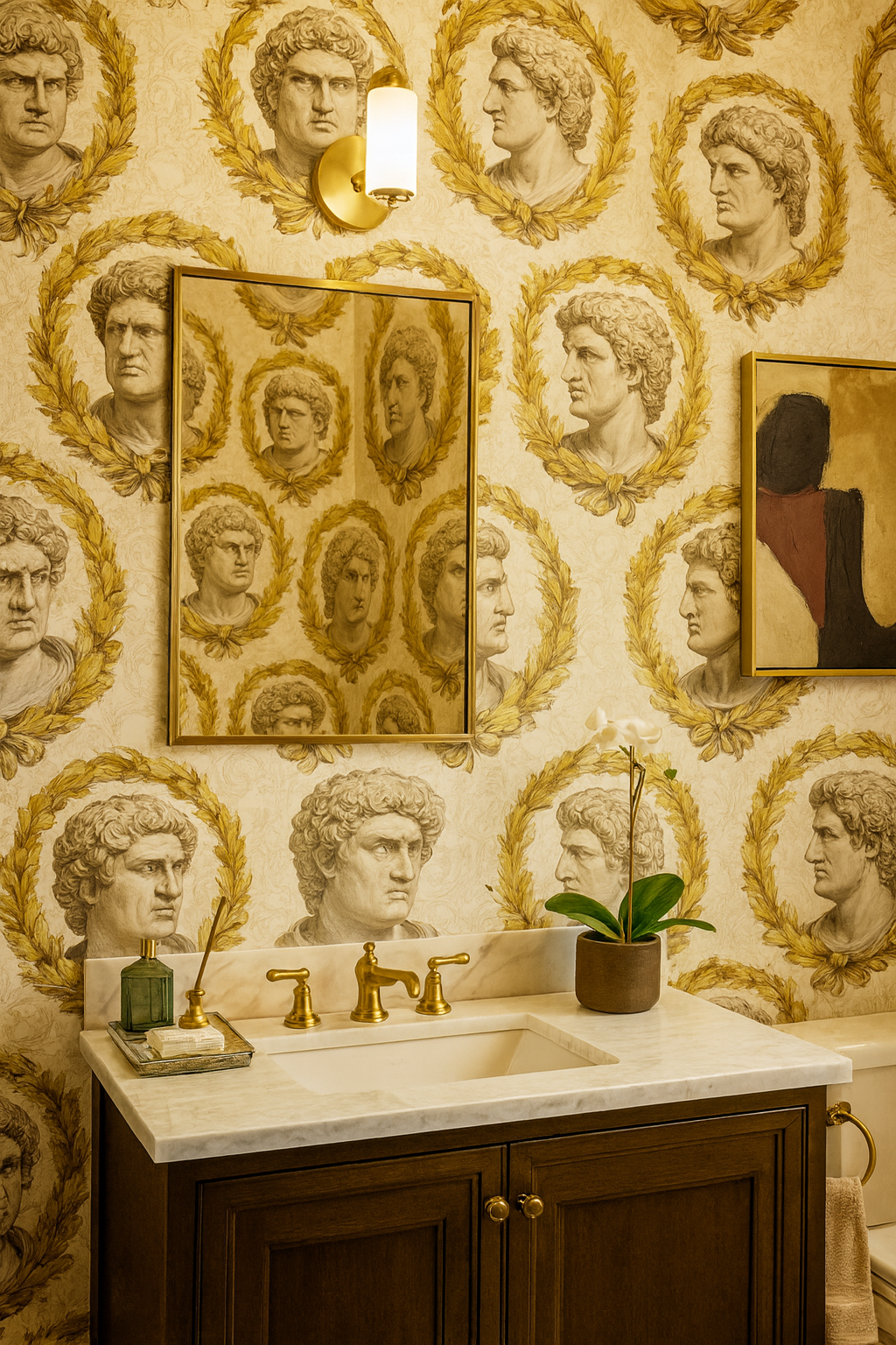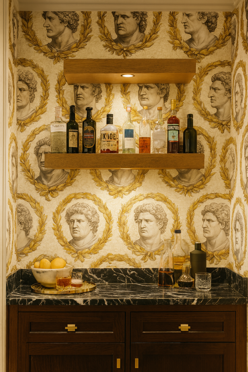 Grand classical busts are encircled by golden laurel wreaths, evoking triumph and authority. The design recalls the engravings of ancient Rome, with faces rendered in fine detail against a background of subtle ornamental scrollwork. The interplay of muted grays and sepia with golden ochre creates a commanding palette steeped in history and grandeur. Laurel Imperium transforms walls into museum-worthy installations, perfect for studies, galleries, or high-ceilinged foyers where drama is welcome. It thrives alongside marble, dark woods, and richly upholstered furnishings, lending gravitas and intellectual flair.