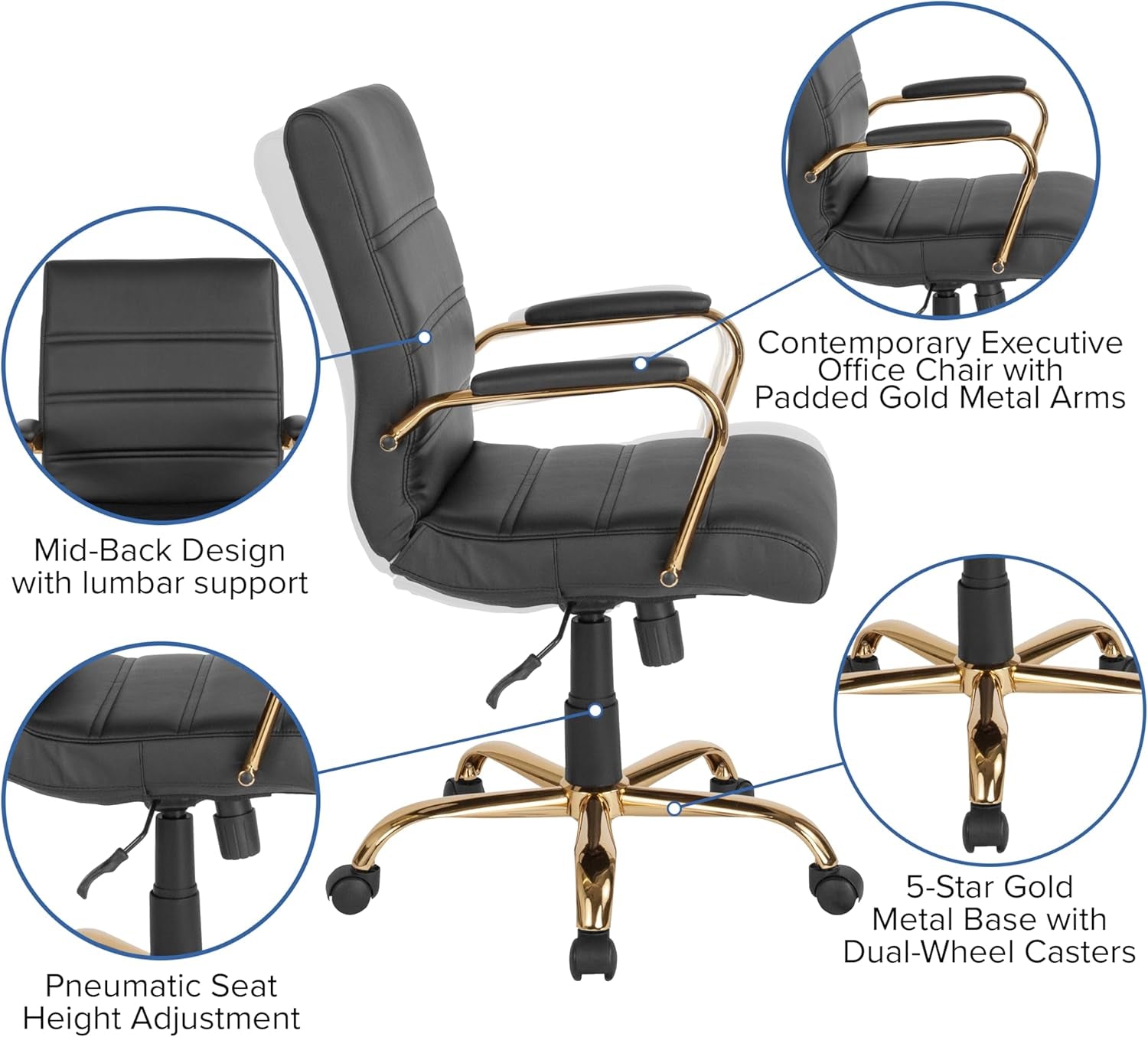 The Whitney Mid-Back Swivel Desk Chair blends a LeatherSoft back and seat with a black-and-gold finish for a look that suits modern offices, nail salons, car shops, retail spaces, dorm rooms, and home offices. It’s built to keep busy professionals and students comfortable from first coffee to last deadline.