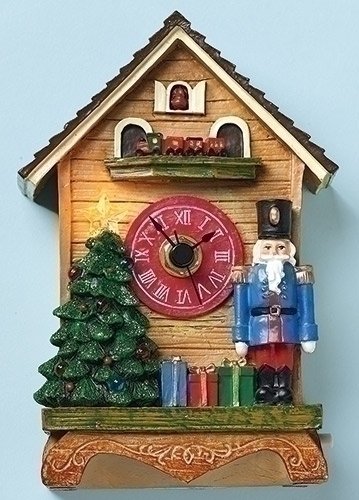 Handpainted Resin Clock for tabletop or Hearth use. Clock and music work independently. Clock requires 1 AA battery, music box uses 2 AAA. Plays a random song from a collection of Chistmas Songs and the star treetop lights up each hour (or when the small button on the side is depressed)