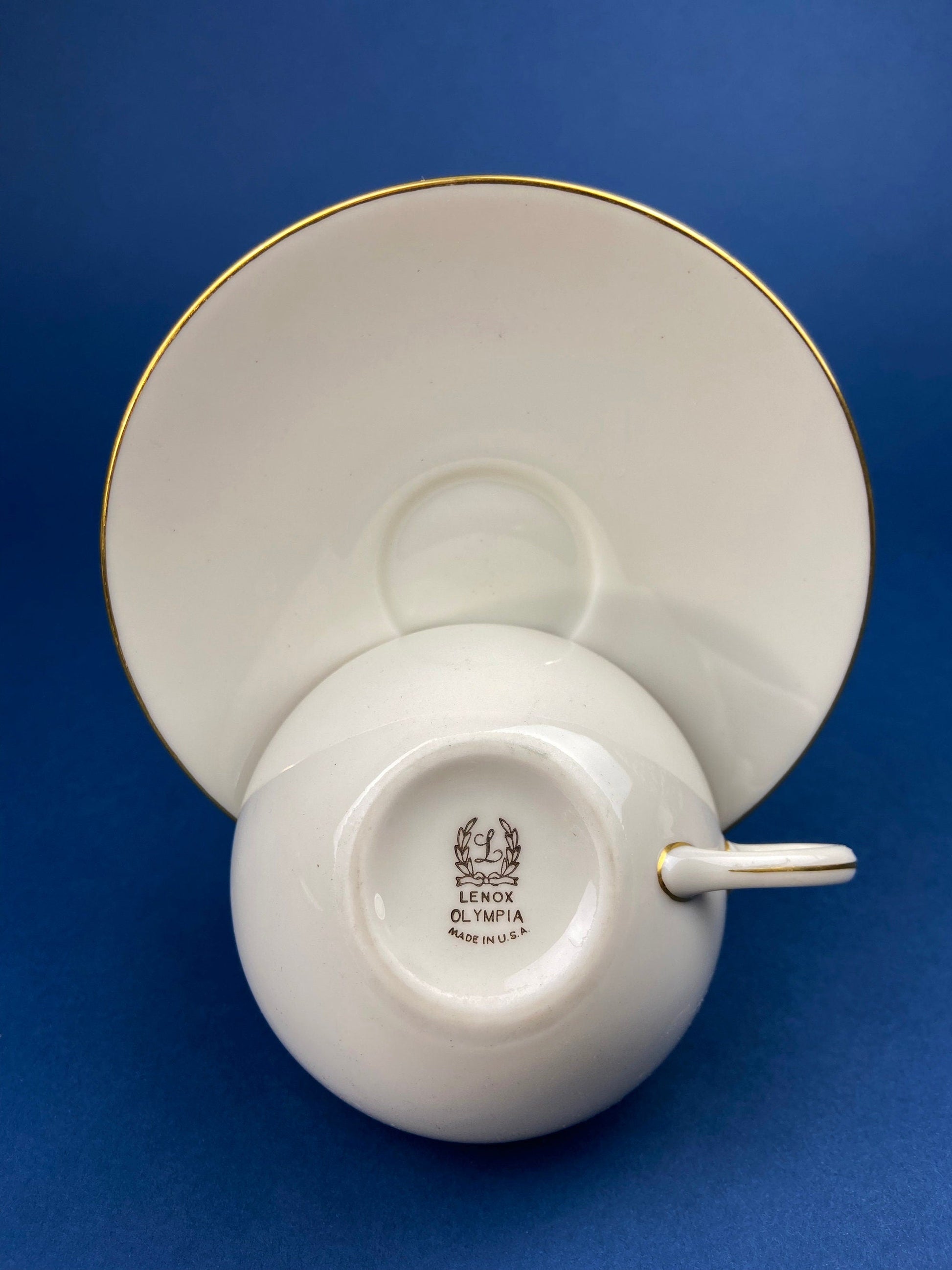 Tea Cup and Saucer By Lenox. Creamy White with Gold Rim Tea or Coffee Set. Olympia by Lenox. Porcelain Made in the USA. Marked by Manufacturer. All items are in excellent condition. No chips no cracks.