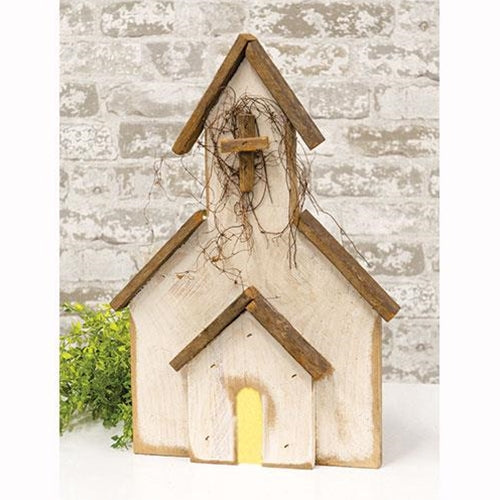 Light Up Old Church is made in the USA and features a painted and distressed white finish with dark wood roofing. Church is a wooden light-up box that is accented by dried vine and a wooden cross and it features a hole on the front for light to shine through and a hole on the back panel for its cord. Cord is black with an inline switch, candelabra socket, and a 5-watt, non-flicker bulb that lights up its interior and it is open on the bottom for use with flameless candles. Measures 19" high by 12.75" wide by 5" deep.