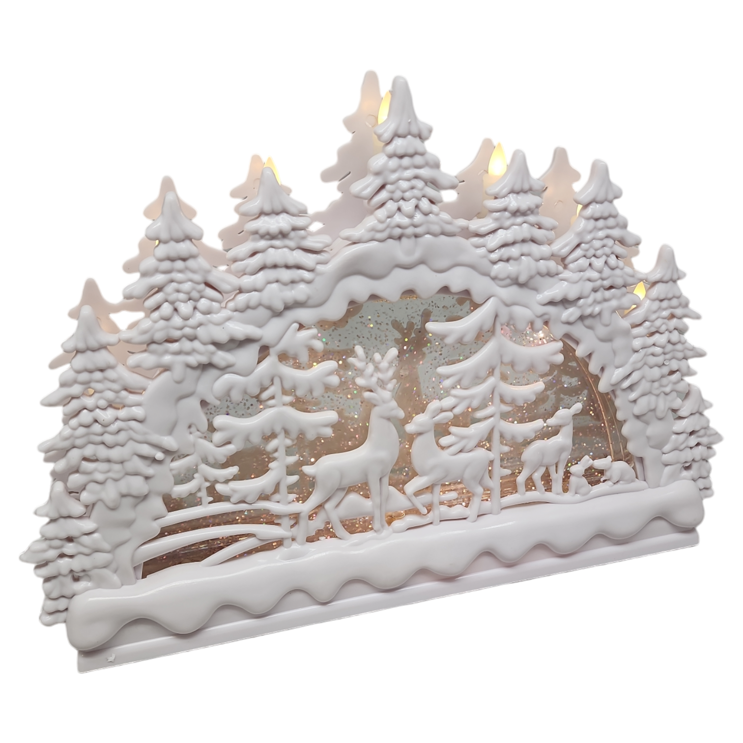 Transform your holiday decor with this enchanting Winter Wonderland LED Arch. Standing just over 9 inches high and spanning 14 inches wide, this beautiful piece captures a serene snowy forest scene with elegantly crafted deer and towering pine trees. The intricate white design radiates simplicity and elegance, making it a standout decoration for any space.