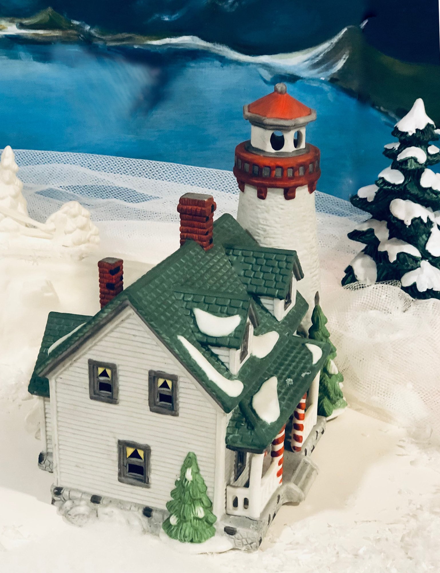 Lighthouse by Department 56. Craggy Cove / New England Village Series. Hand Painted Porcelain Building with Lights. It has many beautiful details. Excellent vintage condition. Marked and dated by manufacturer. Trees and background shown in photos are for presentation only, and are not included in the price.