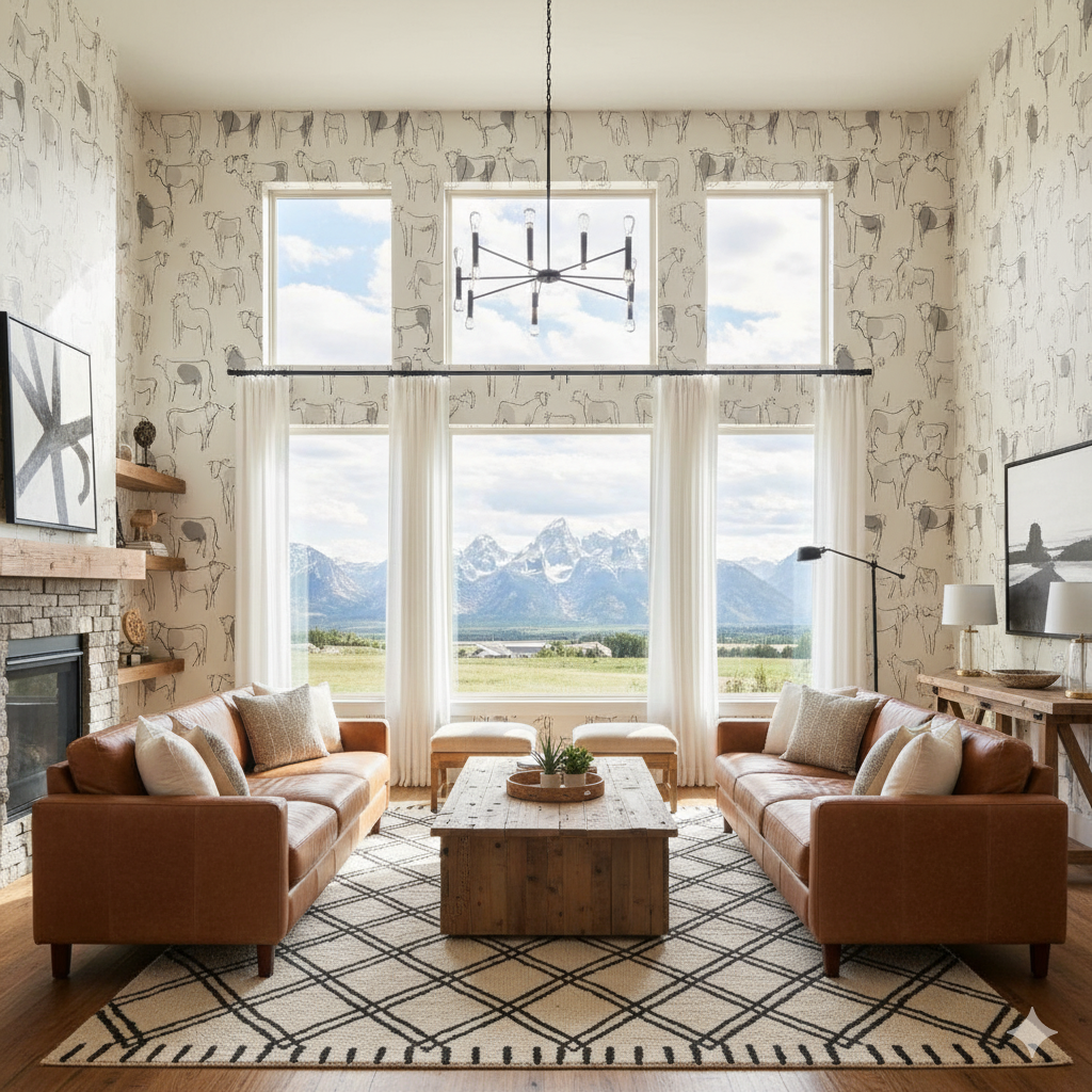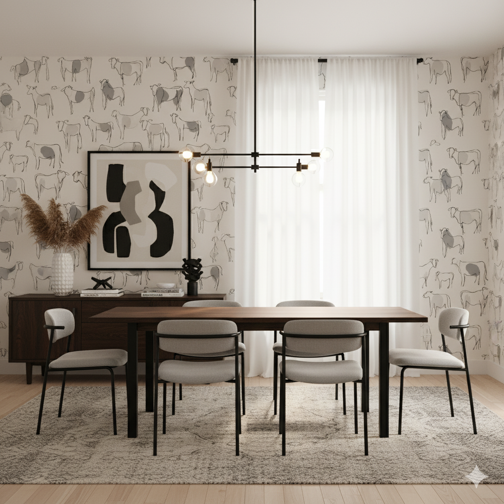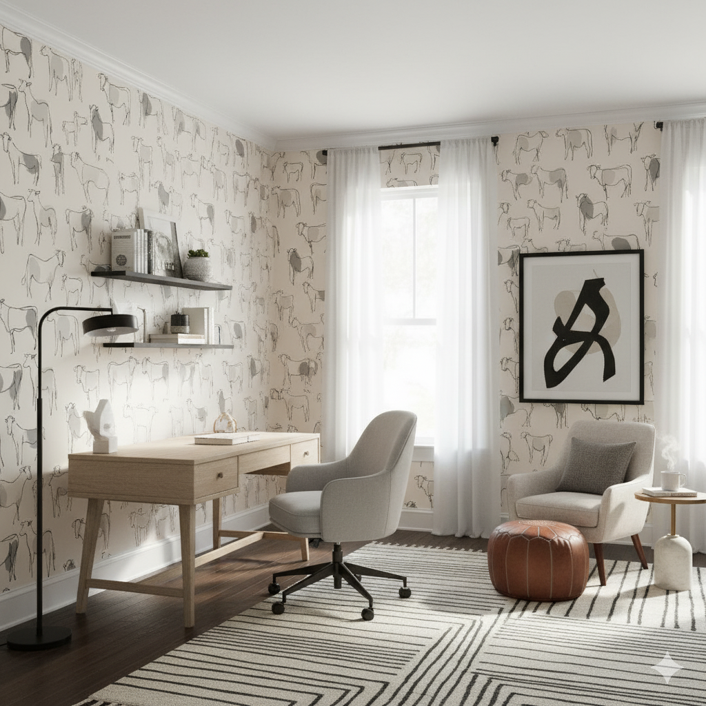 Minimalist continuous-line drawings of cattle repeat across a cream ground, accented with loose gray shading that suggests movement and volume without breaking the spare style. This is a refined, artistic interpretation of ranch life — more abstract than literal. Perfect for modern farmhouses, Scandinavian-inspired interiors with rustic undertones, or creative spaces where hand-drawn artistry is appreciated. Its airy quality makes it well-suited for hallways, studios, or nurseries where you want Western themes with a lighter touch.