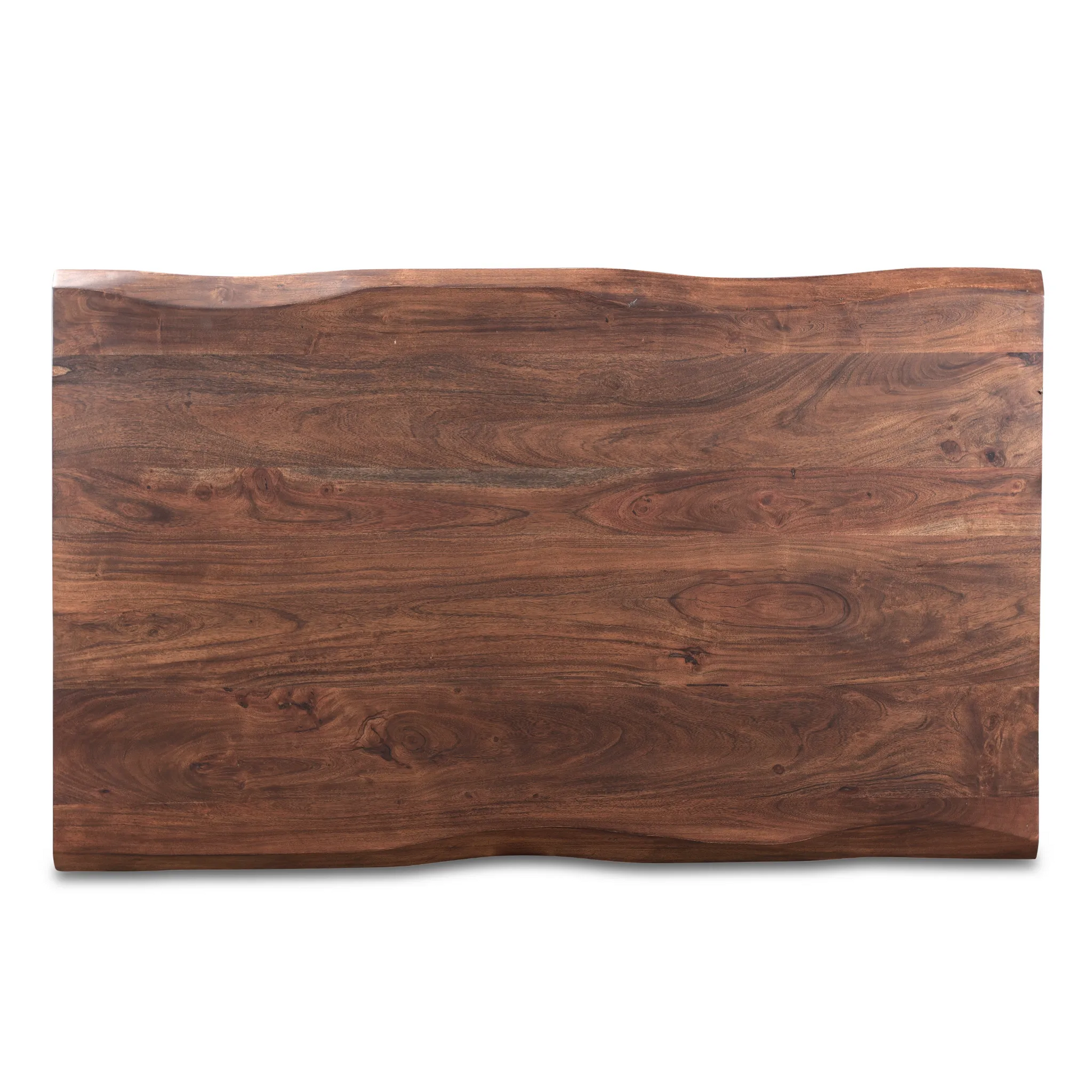 This elegant dining table boasts a rectangular shape crafted from solid Seesham wood, enhanced by modern gold iron legs. Each table is unique, featuring distinctive markings that add personality. Every natural knot, crack, and distinction is carefully preserved and celebrated. Perfectly complemented by our accompanying live edge dining bench, this set adds a touch of sophistication and modernity to any dining room or office space. Made in India, this piece exudes a luxurious and exclusive style with its natural finish in black and brown.