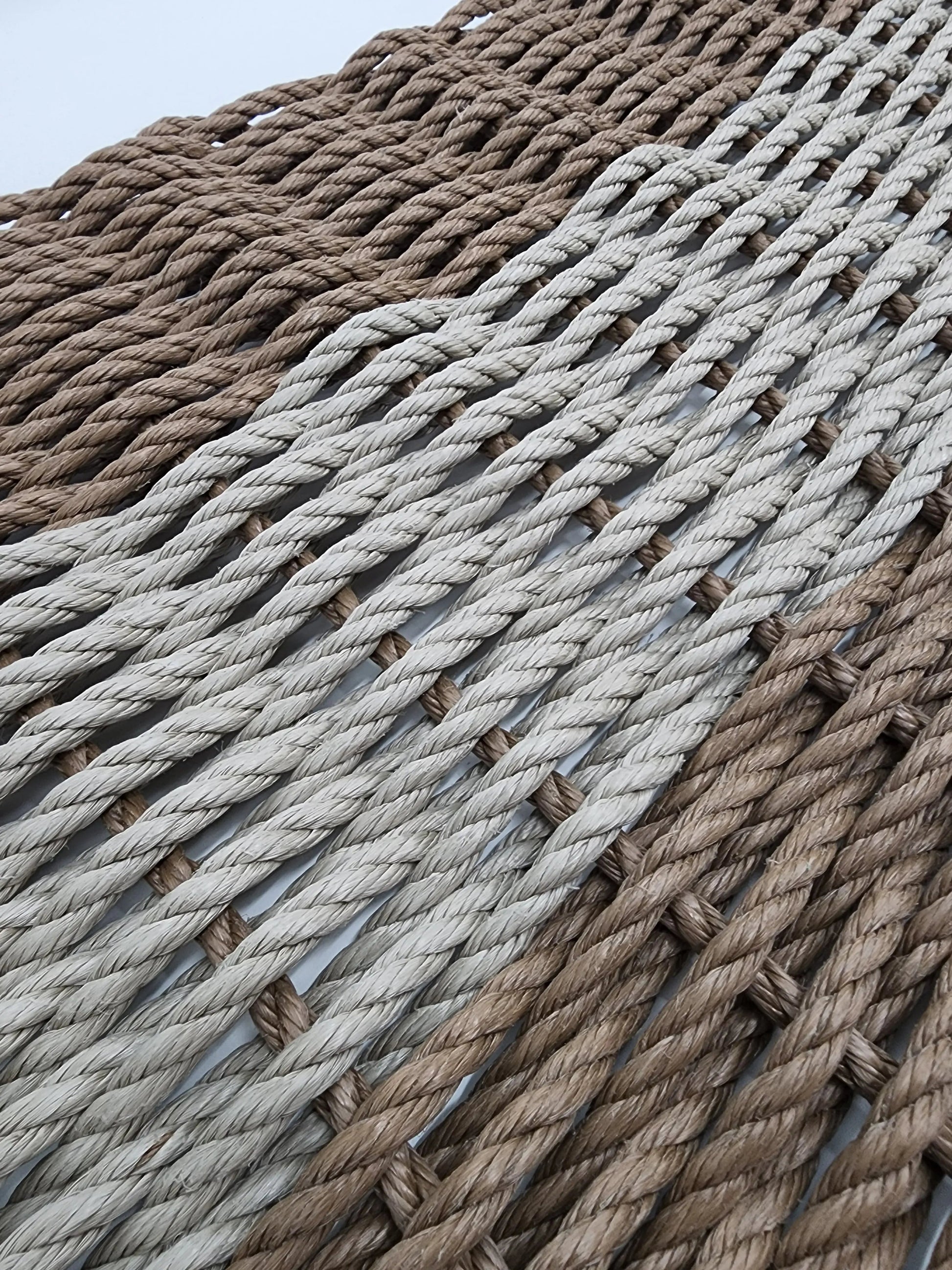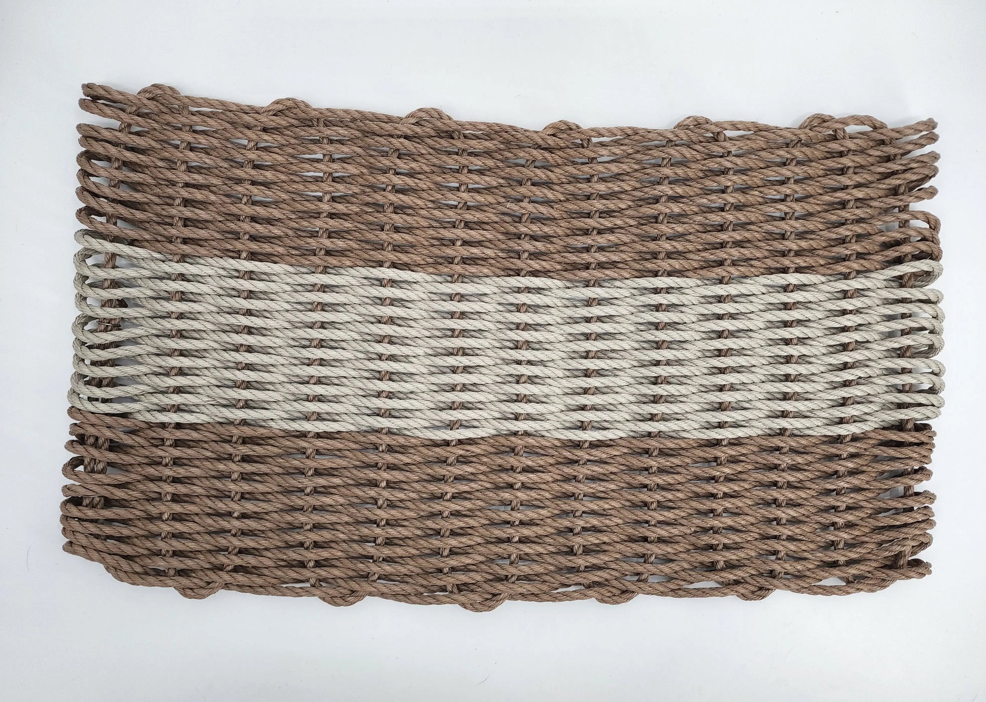A beautiful Brown and tan, more natural color, hand made rope mat made on the coast of Maine using the very same rope that lobstermen use to tend their traps.