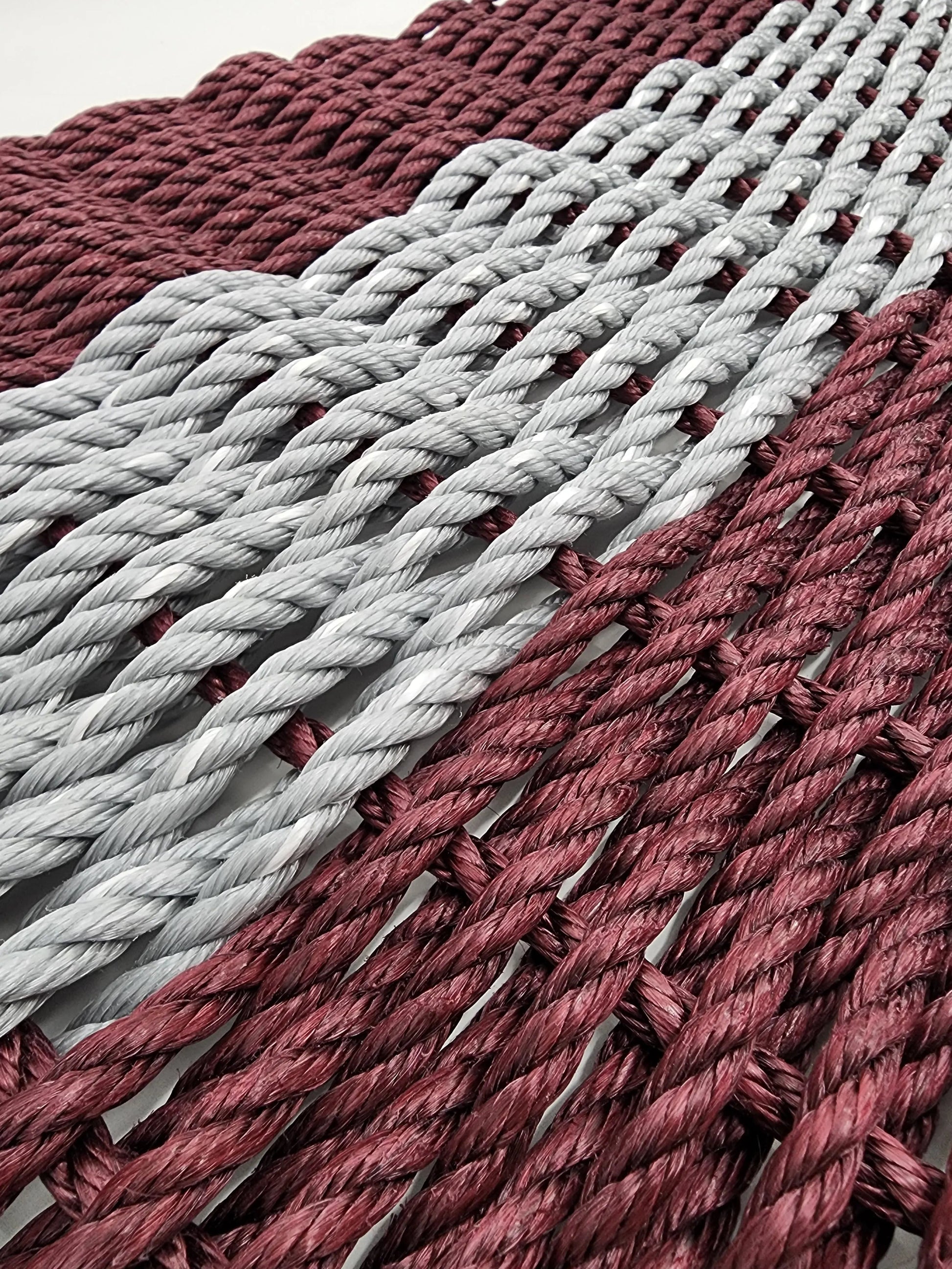 A beautiful burgundy and light gray, hand made rope mat made on the coast of Maine using the very same rope that lobstermen use to tend their traps.