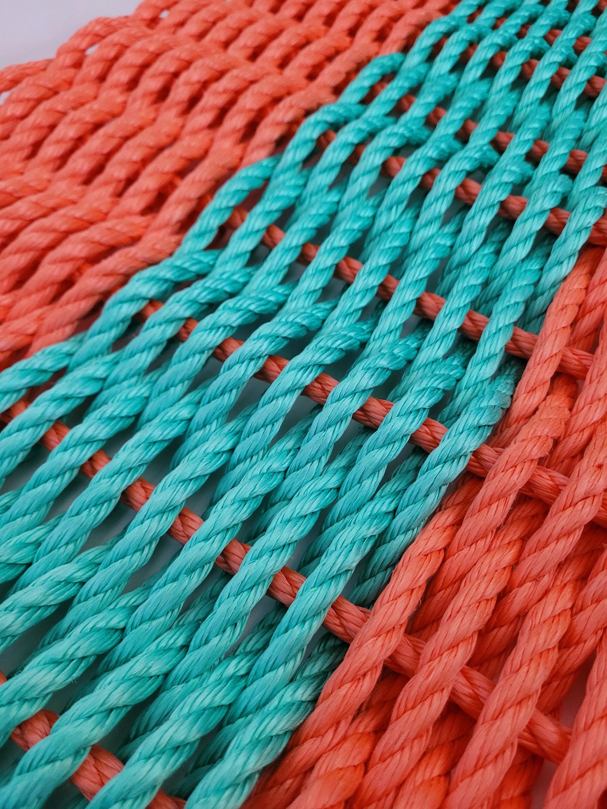 A beautiful coral orange and teal hand made rope rug made on the coast of Maine using the very same rope that lobstermen use to tend their traps.