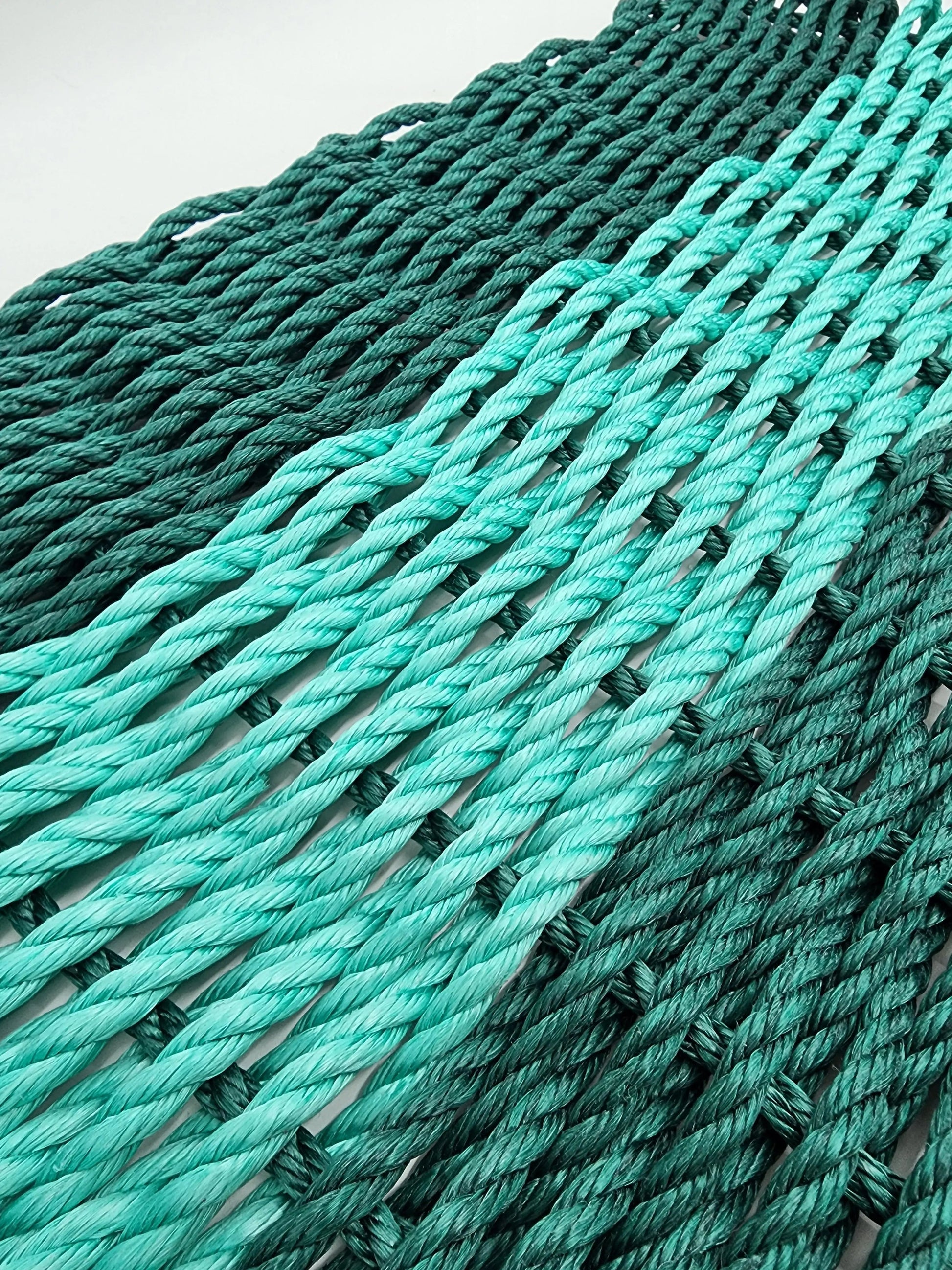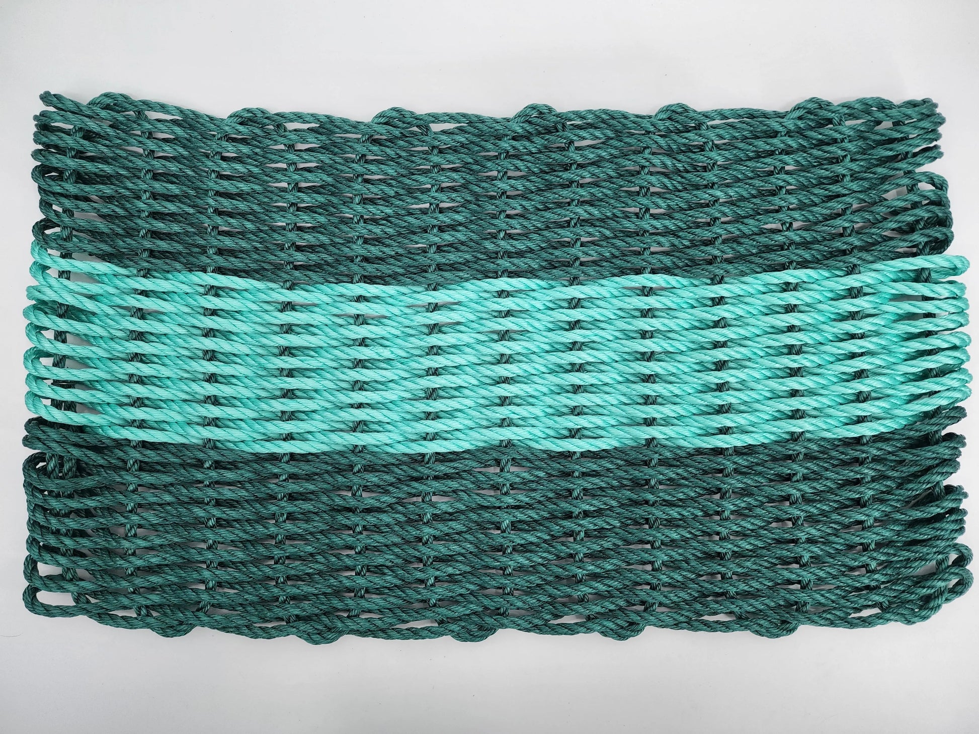 A beautiful hunter green and teal hand made rope mat made on the coast of Maine using the very same rope that lobstermen use to tend their traps.