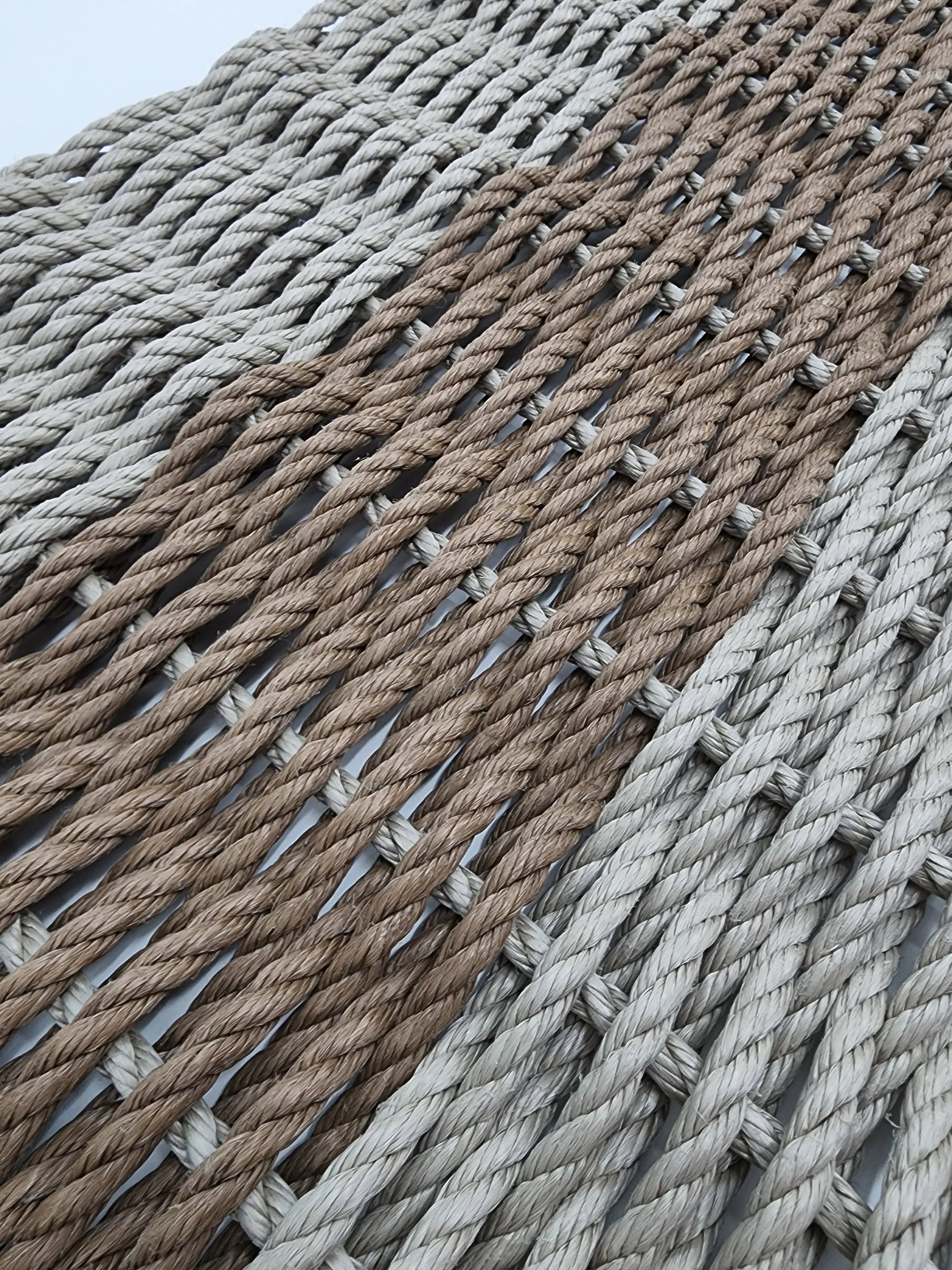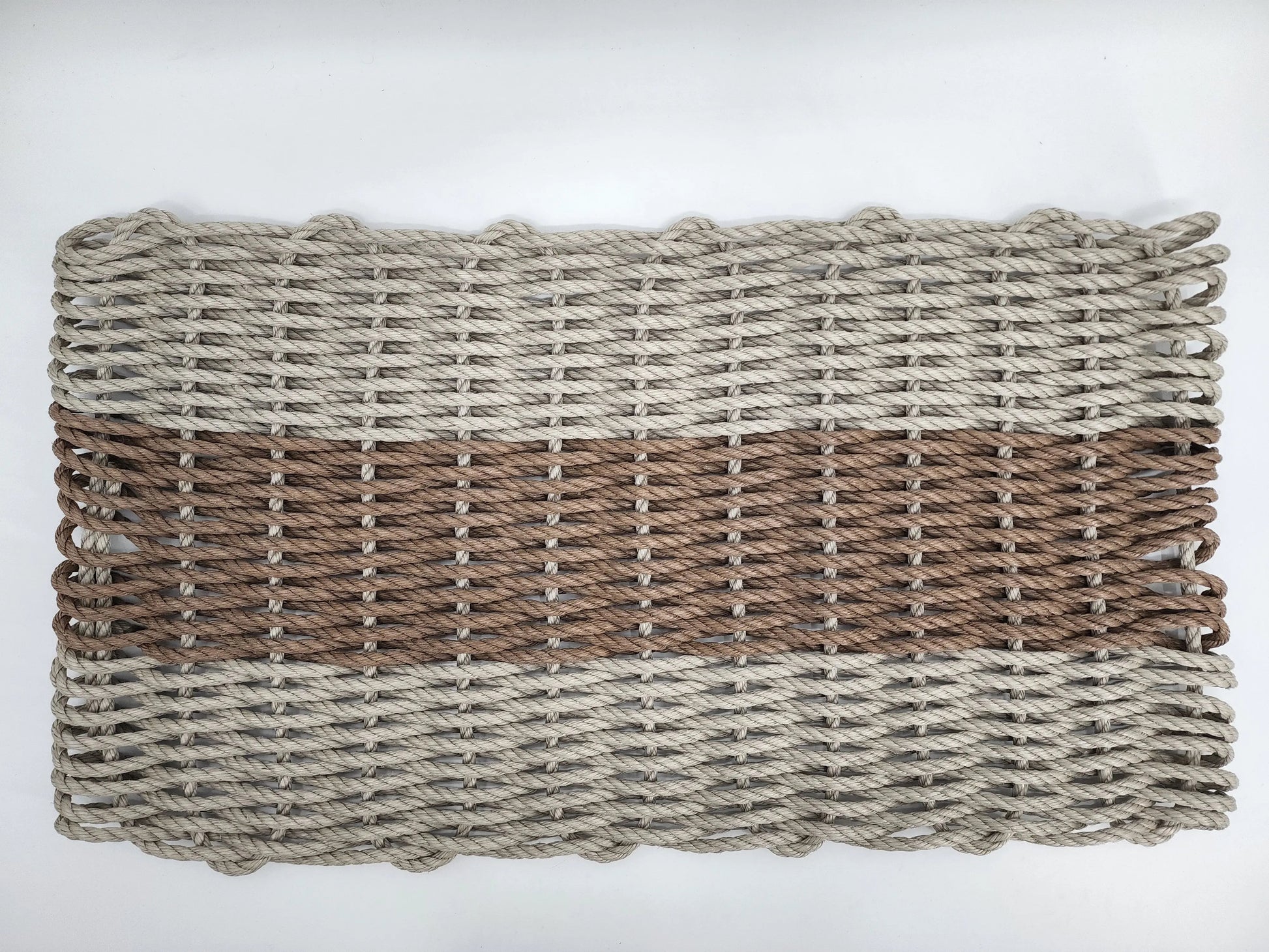 A beautiful Tan and Brown, more natural color, hand made rope mat made on the coast of Maine using the very same rope that lobstermen use to tend their traps.
