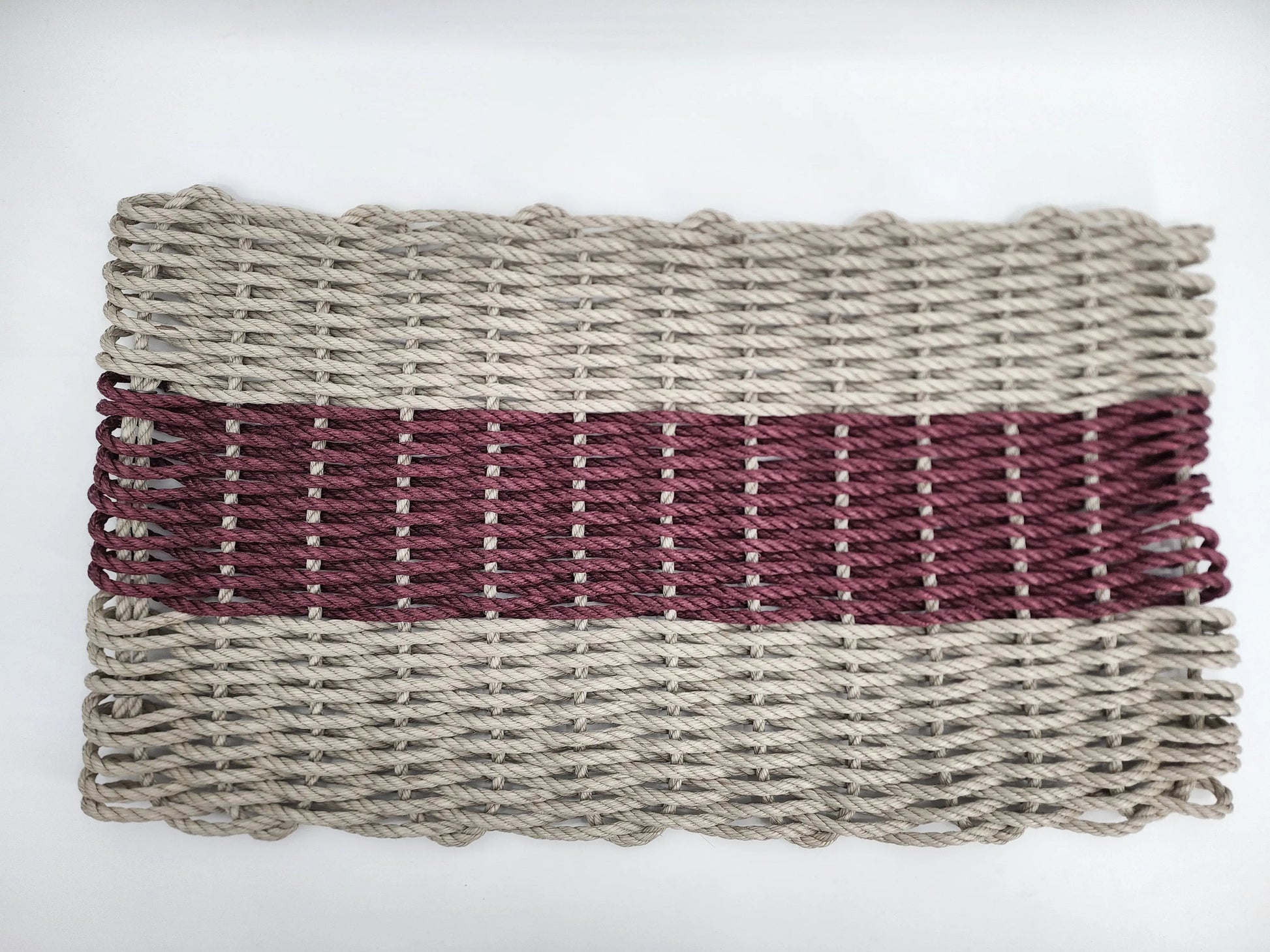 A beautiful Tan and Burgundy, more natural color, hand made rope mat made on the coast of Maine using the very same rope that lobstermen use to tend their traps.