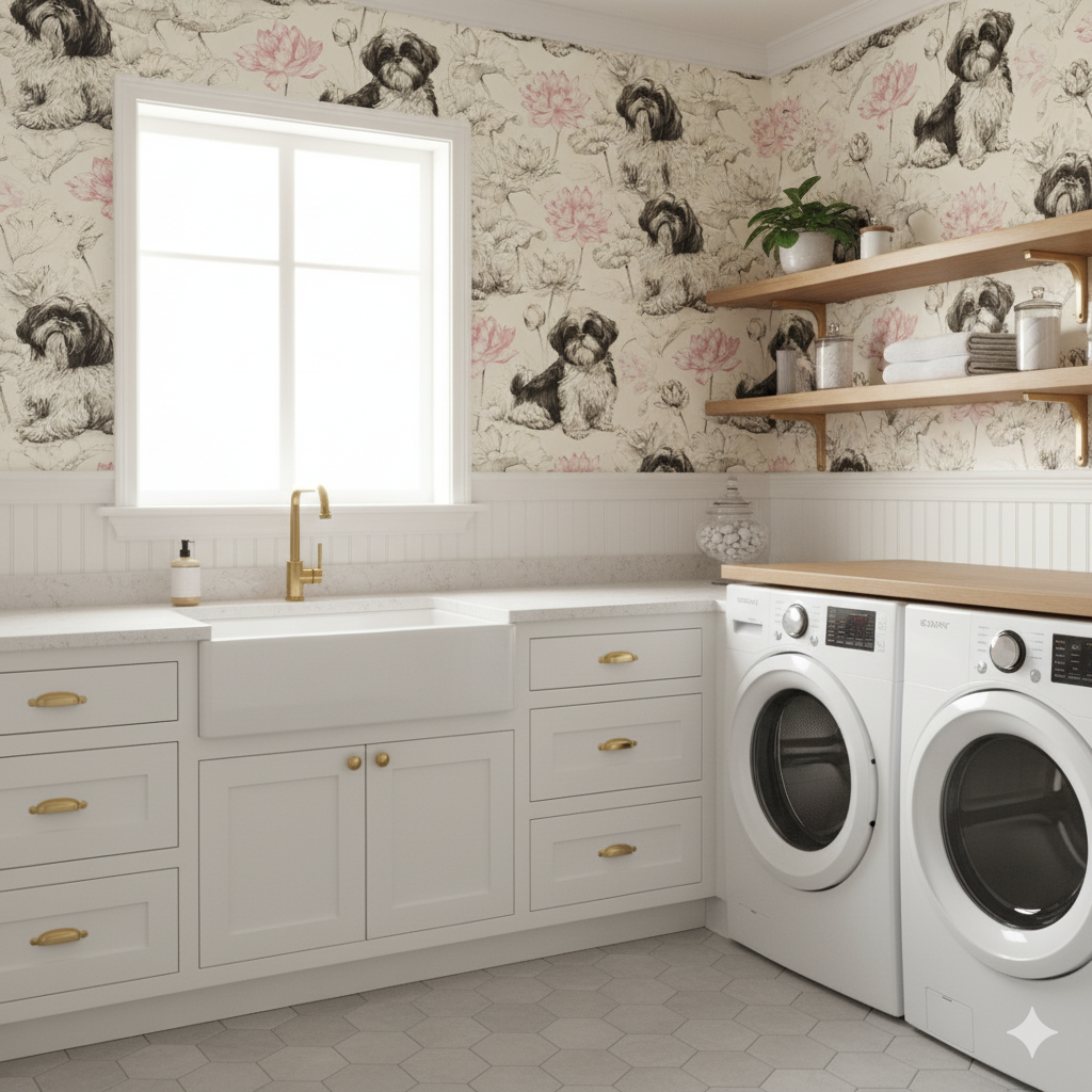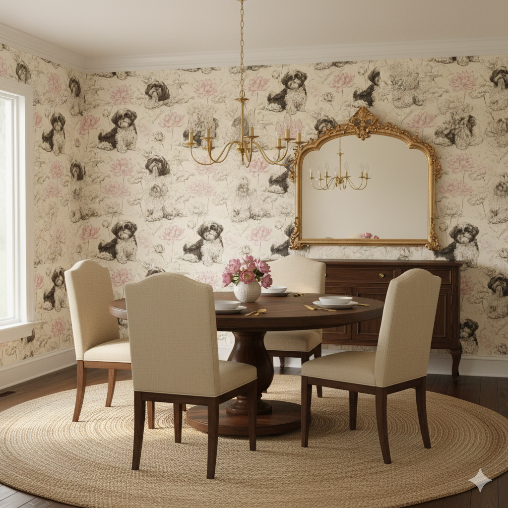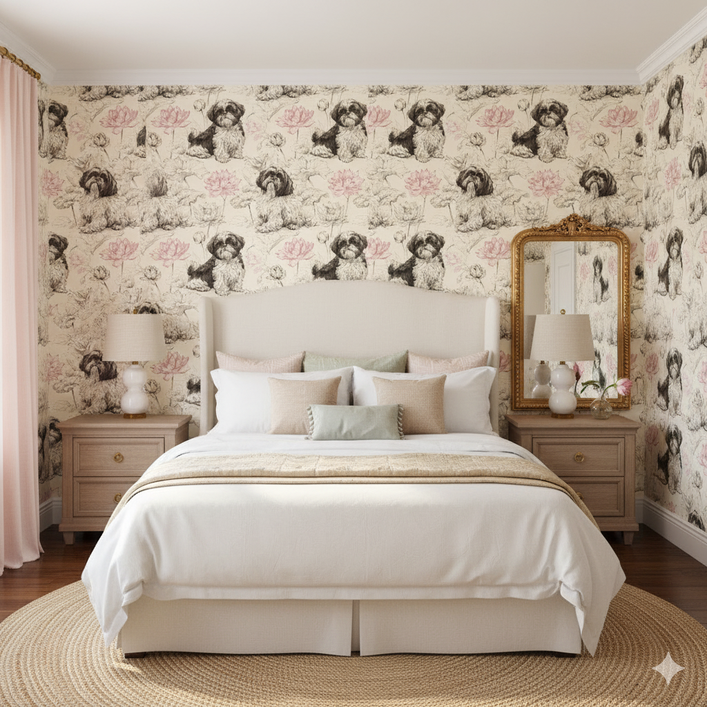 Shih Tzus are drawn in delicate black ink, surrounded by soft lotus blossoms in blush pink outlines on a cream background. The balance of detailed sketching with minimal color creates a refined, contemporary elegance. This wallpaper works beautifully in serene bedrooms, upscale pet boutiques, or even eclectic dining rooms where artful design is appreciated. Its restrained palette ensures versatility, while the subject matter adds warmth and humor. Good SEO pairings would be "Shih Tzu wallpaper," "lotus flower dog wallpaper," and "sketched pet wall art."