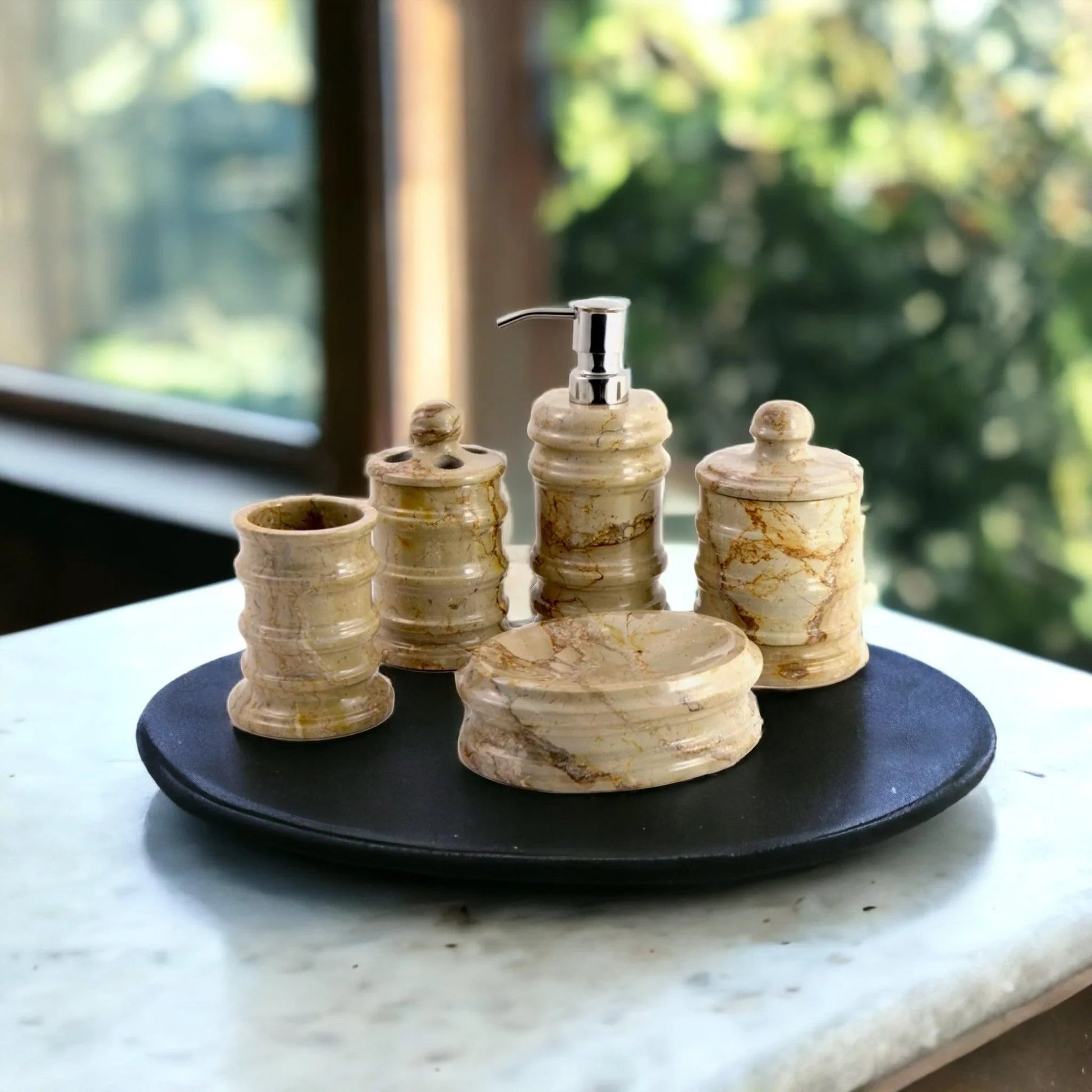 Elevating your bath area to a new level of grace, this set of five bathroom accessories is masterfully crafted from the most sought-after Sahara Beige Marble, by artisans as part of Bengal Collection by Nature Home Decor. Boasting exquisite polish, this set is sure to be a luxurious addition to your bathroom.
