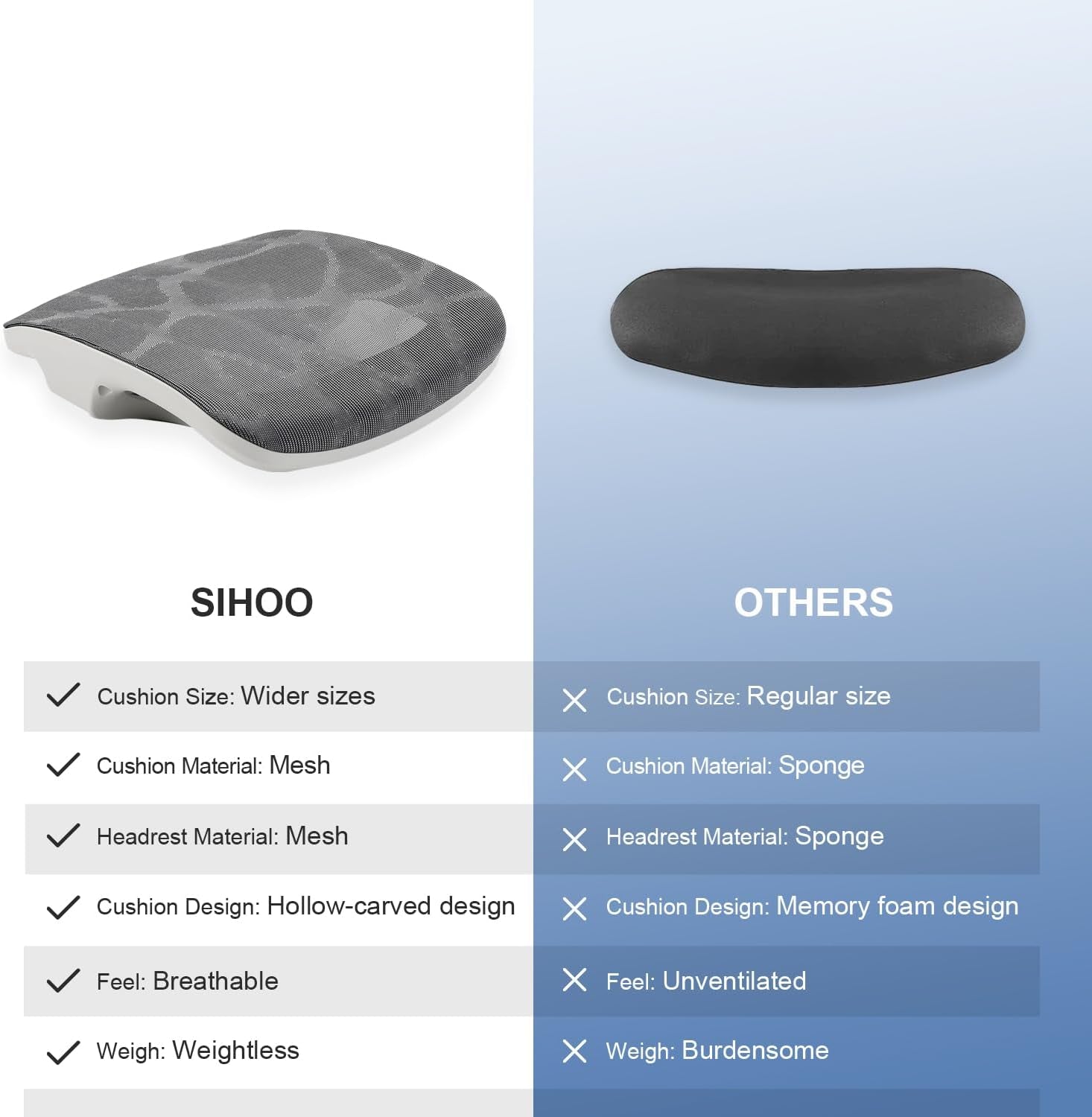 - Ridge backrest: Contoured to mirror the spine and relieve spinal pressure.
