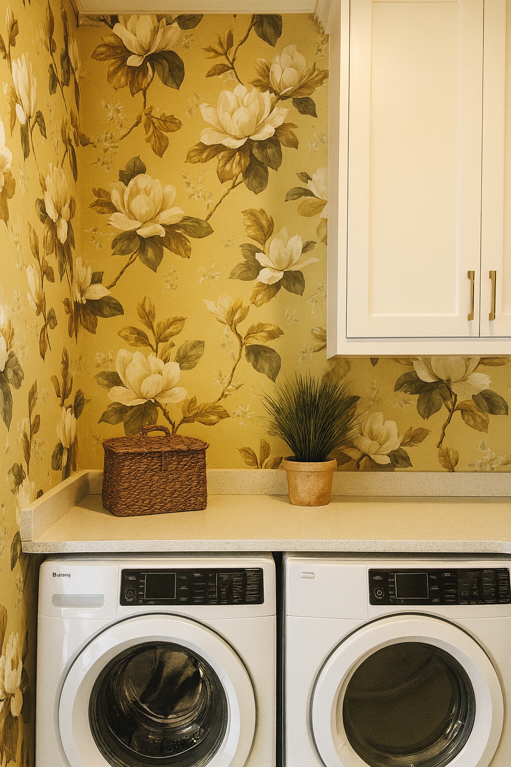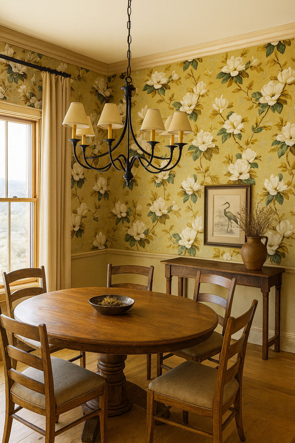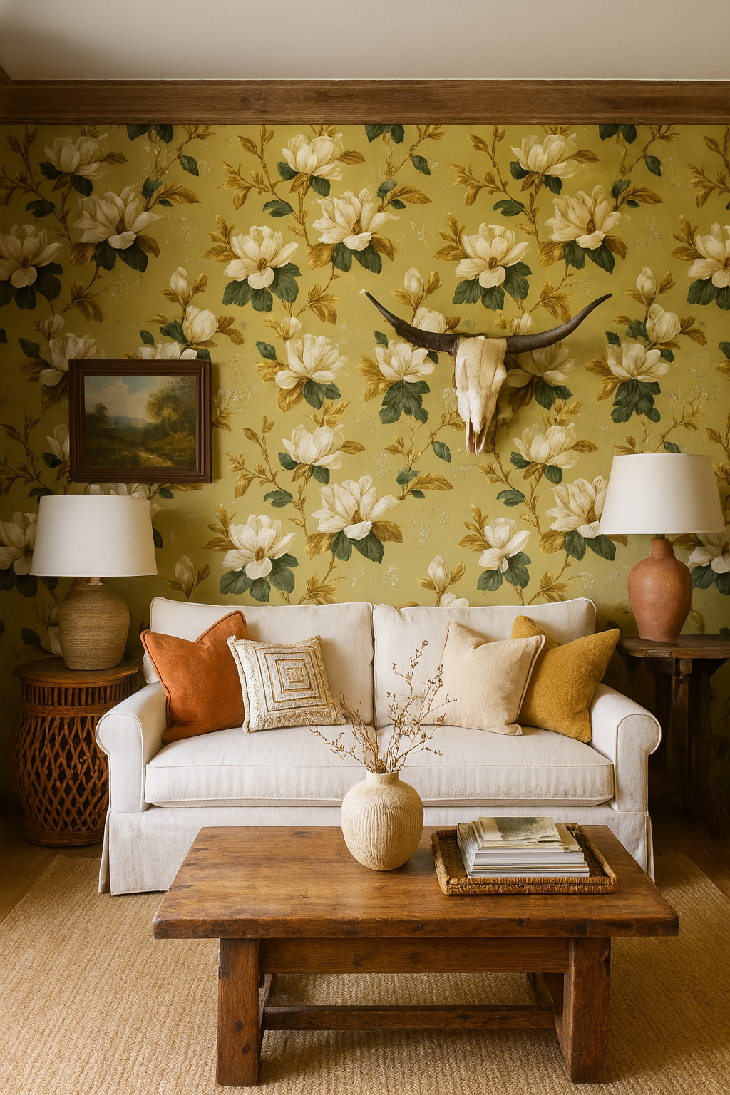 Magnolia Moonlight exudes Southern elegance with its oversized white magnolia blossoms unfurling against a muted golden-olive background. Detailed brushstroke textures in cream, soft taupe, and leafy greens lend the pattern a painted realism, making it perfect for sophisticated dining rooms, sitting parlors, or boutique hotel suites.