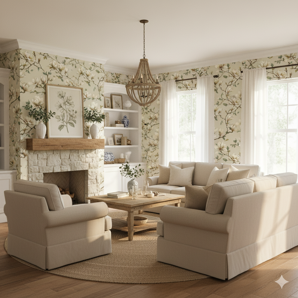 Magnolia Murmurs captures the delicate elegance of blooming magnolia branches rendered in loose ink and watercolor. Creamy petals with blush undertones perch along winding sepia twigs, against a muted sage-beige background. This wallpaper suits serene bedrooms, vintage powder rooms, or transitional living spaces looking for soft, botanical drama.