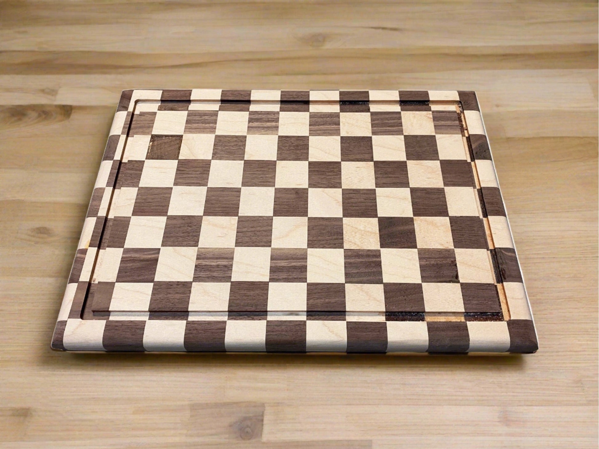 Designed with a checker pattern of Walnut and Hard Maple wood together. Each board is sanded to a smooth to the touch finish and inspected by hand to ensure there are no splinters or rough areas that could invite bacteria into your cooking surface. It’s designed with an optional carved juice groove all around the edges to catch any runaway liquids. Perfect for carving meats, slicing fruits, chopping vegetables, dicing herbs, mincing and more while keeping a clean kitchen. It can even be used as a unique plate to enhance the experience of any meal. Unfinished natural wood. Our customers can choose from any seasoning oil or finishing wax they prefer. When finished, the board carries an attractive deep rich color and natural grain patterns, making it a beautiful piece of home decor to go with its functionality.
