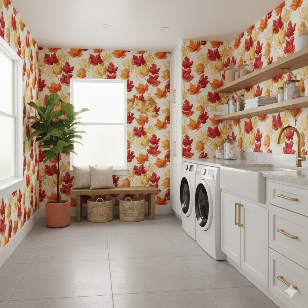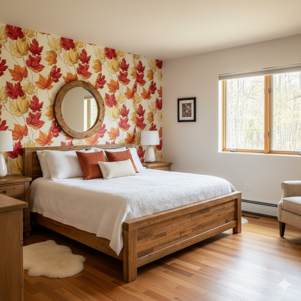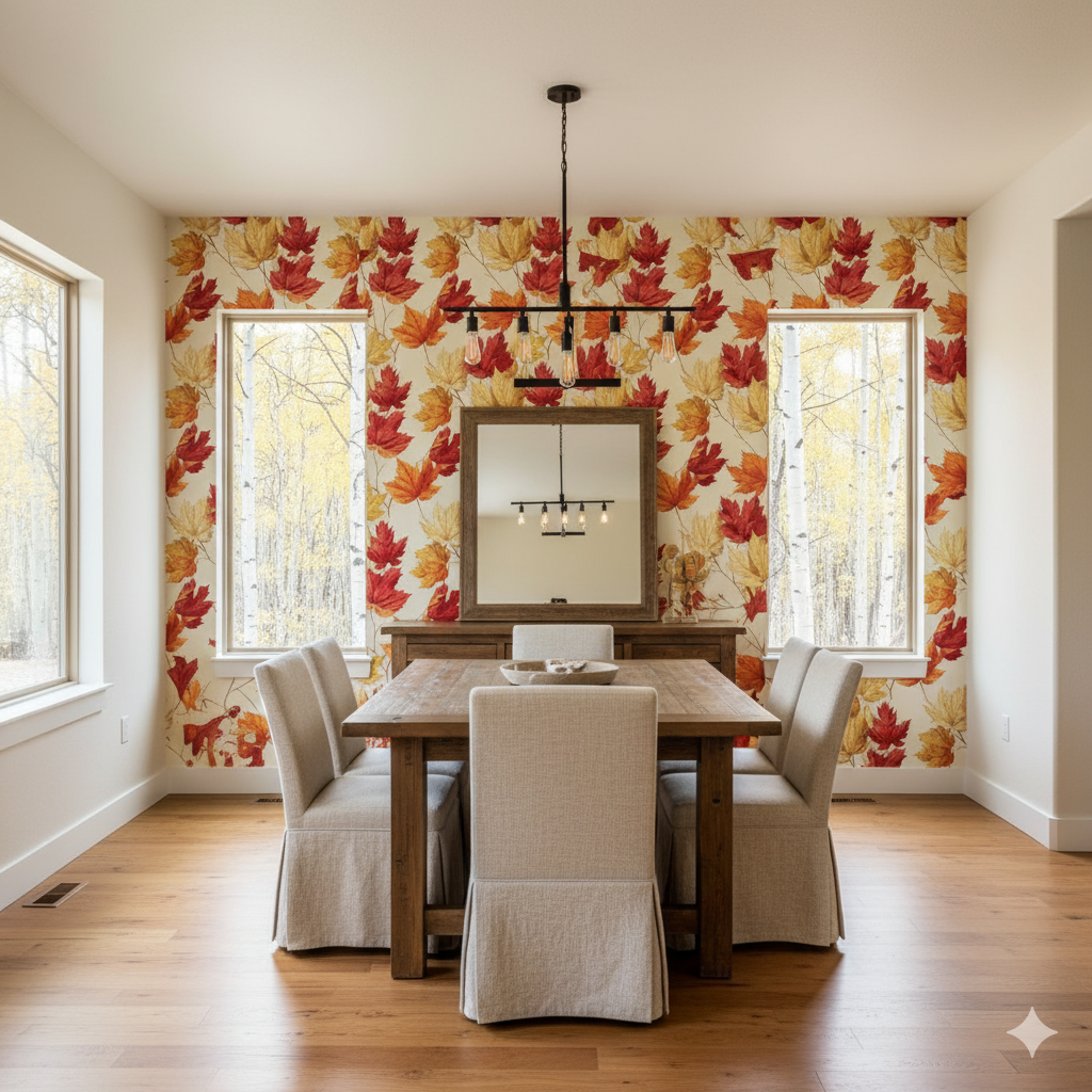 Celebrate the dance of autumn with “Maple Waltz,” featuring watercolor-rendered sugar maple leaves in fiery red, golden yellow, and burnt orange. The overlapping leaves create a sense of fluttering movement, set against a parchment-toned background. Ideal for seasonal decor or cozy cabin walls, this pattern brings the warmth of fall foliage indoors year-round.