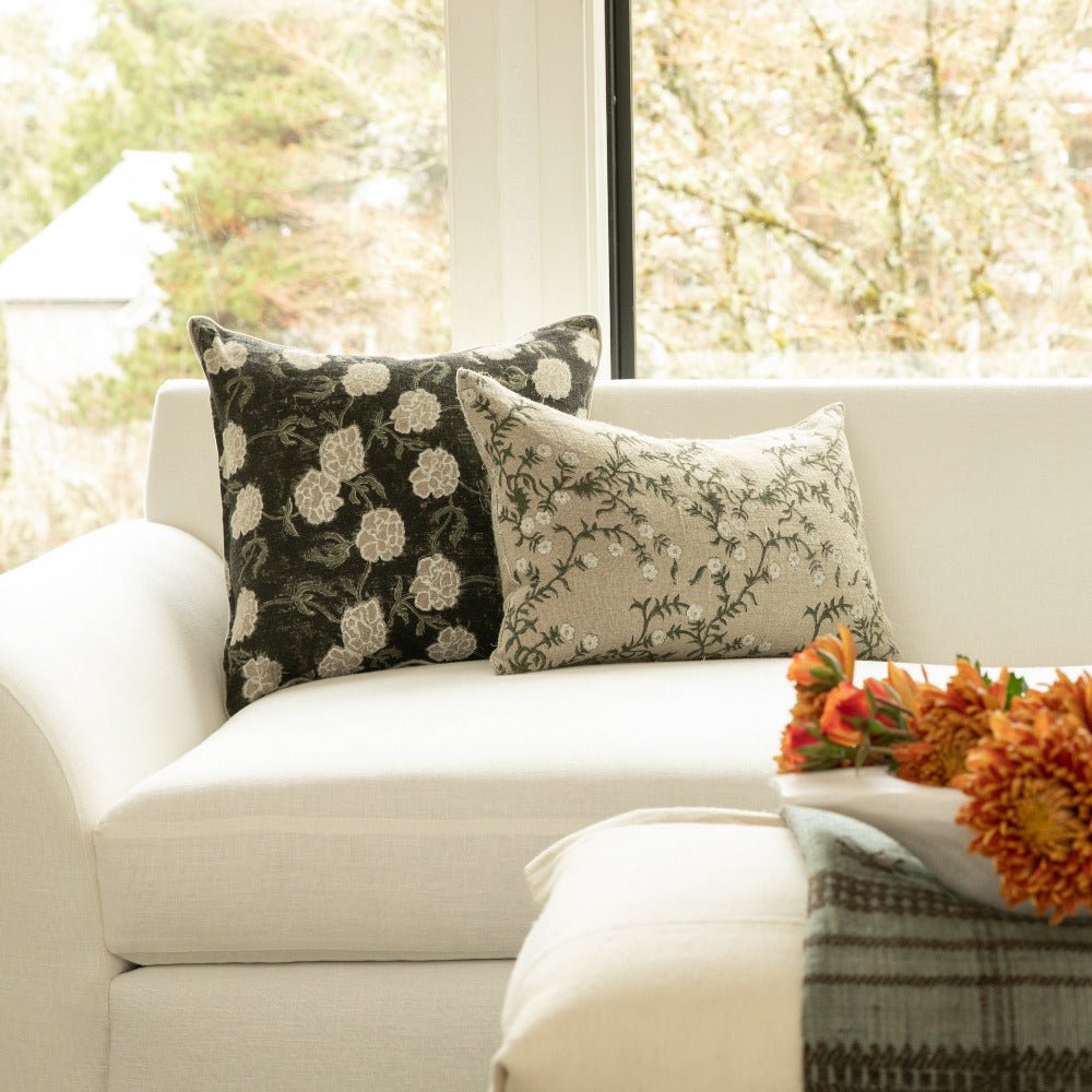 Beautifully hand block-printed throw pillow on linen fabric. Maria is our take on the traditional Indian Wedding flower, the marigold. Symbolizing brightness and positive energy, marigolds are frequently used in wedding decor. Maria features an intricate floral pattern in white and olive on a deep black base. Available in square or lumbar sizes.