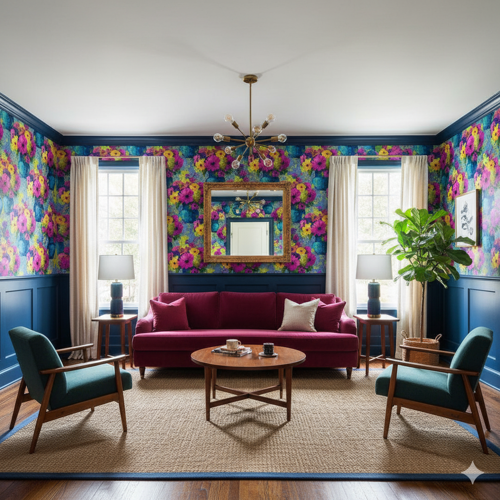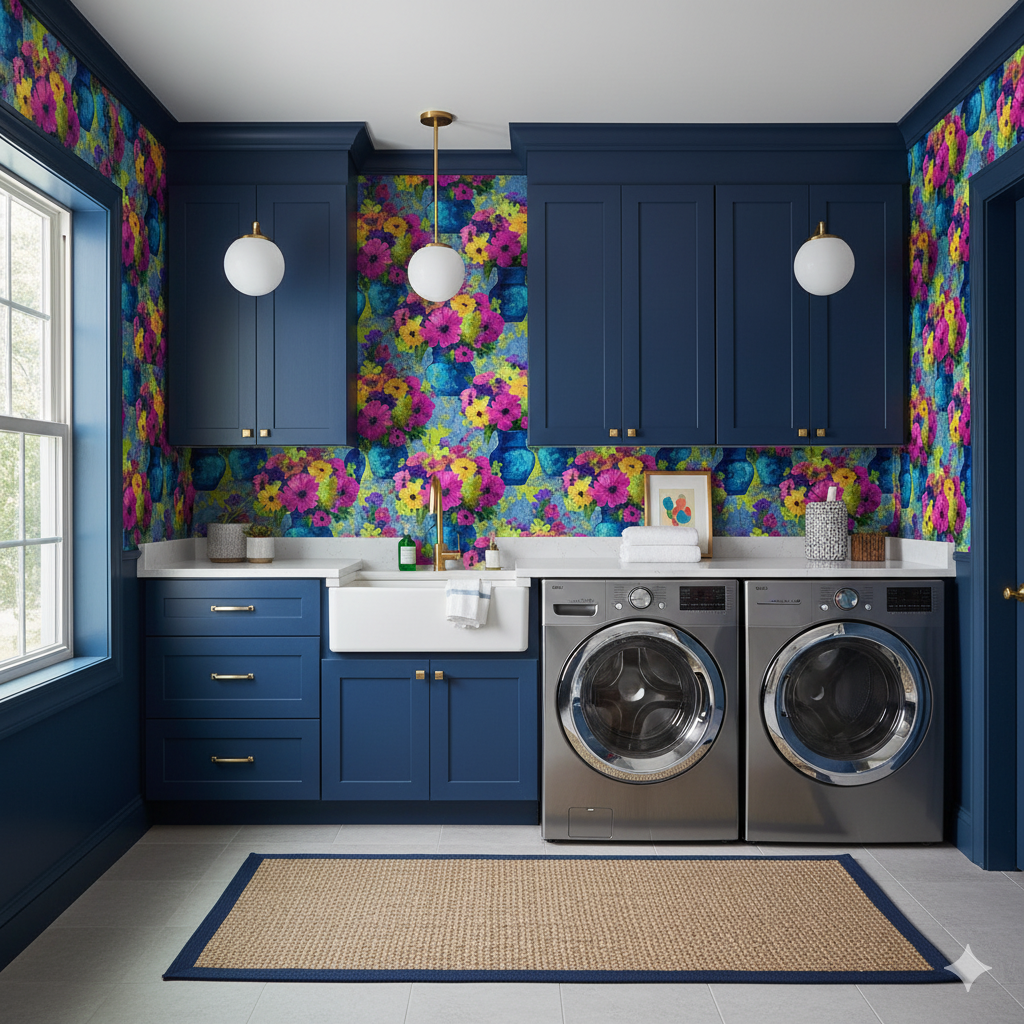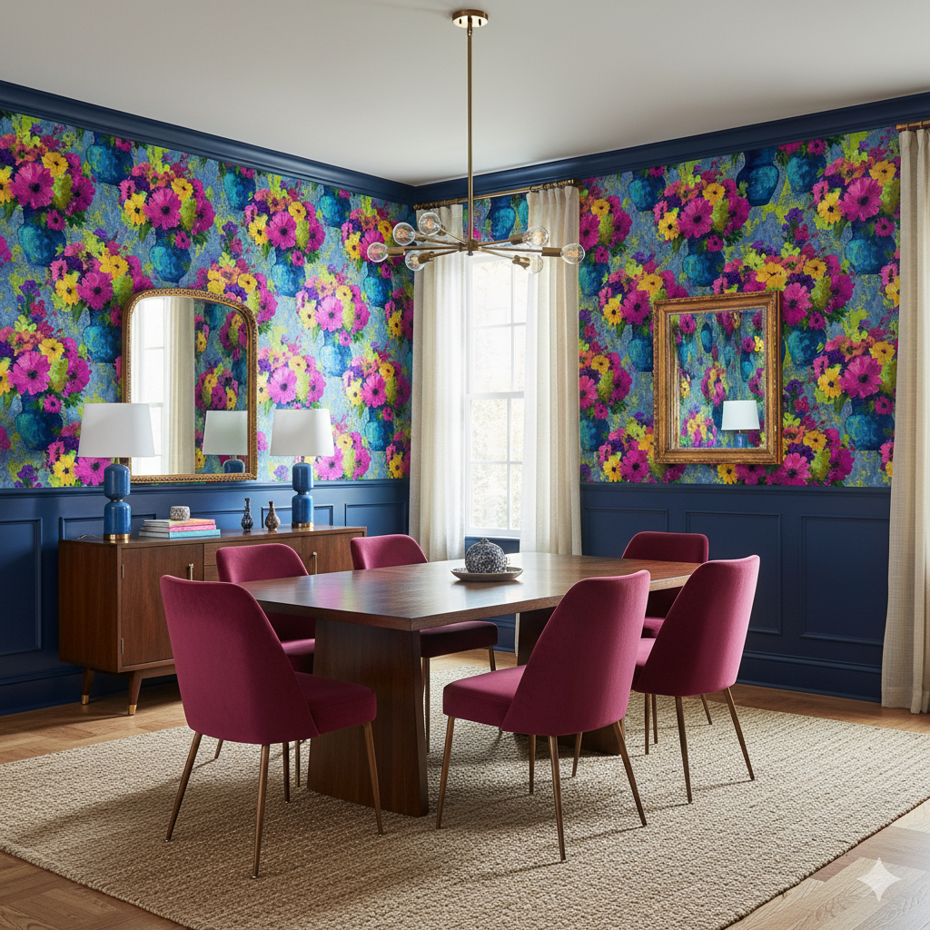 Marseille Bloom is a celebration of florals at full voice — bouquets exploding in fuchsia, tangerine, and lime against a backdrop of lapis blue. The vases, loosely defined in expressive brushwork, feel lifted from a plein-air painting in a Provençal studio. This pattern radiates summer energy and painterly charm, equally suited for kitchen walls, sunrooms, or eclectic salons filled with light. The contrast of cobalt and magenta gives it a contemporary twist, while the texture suggests movement and depth. Styled with rattan, warm metals, or vintage ceramics, it brings European art-house flair to any interior.