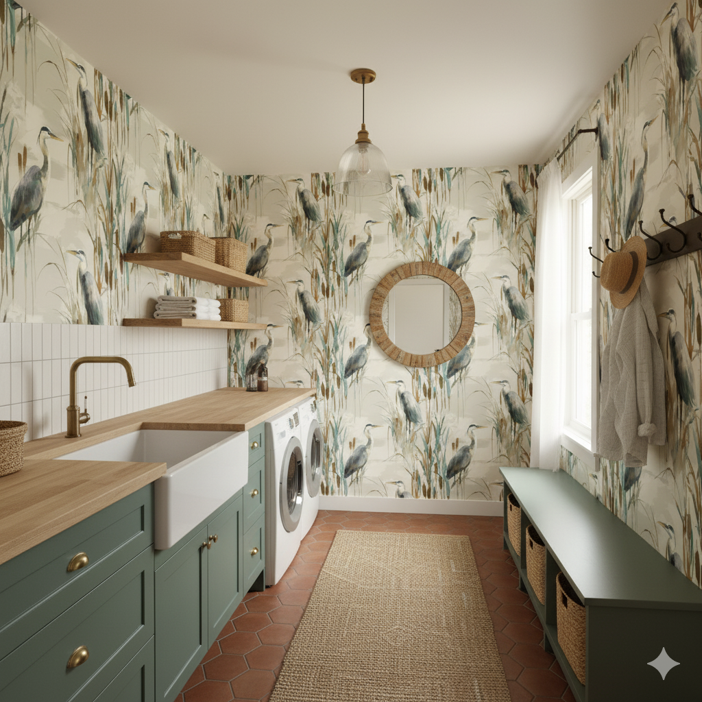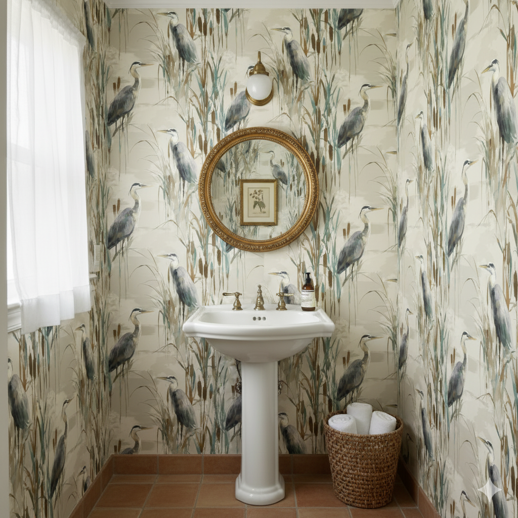 This wallpaper captures the quiet dignity of herons standing tall among cattails and reeds, their slate-gray feathers accented with muted washes of cream and indigo. The composition feels like a painter’s field sketch, translating wetland stillness into a soft, meditative pattern. The earthy palette of tan, sienna, and weathered green makes it easy to pair with organic textures like linen, rattan, or reclaimed wood. It’s a natural fit for lake houses, breakfast nooks, or offices where you want a steadying, contemplative presence—spaces that thrive on balance between water, land, and air.