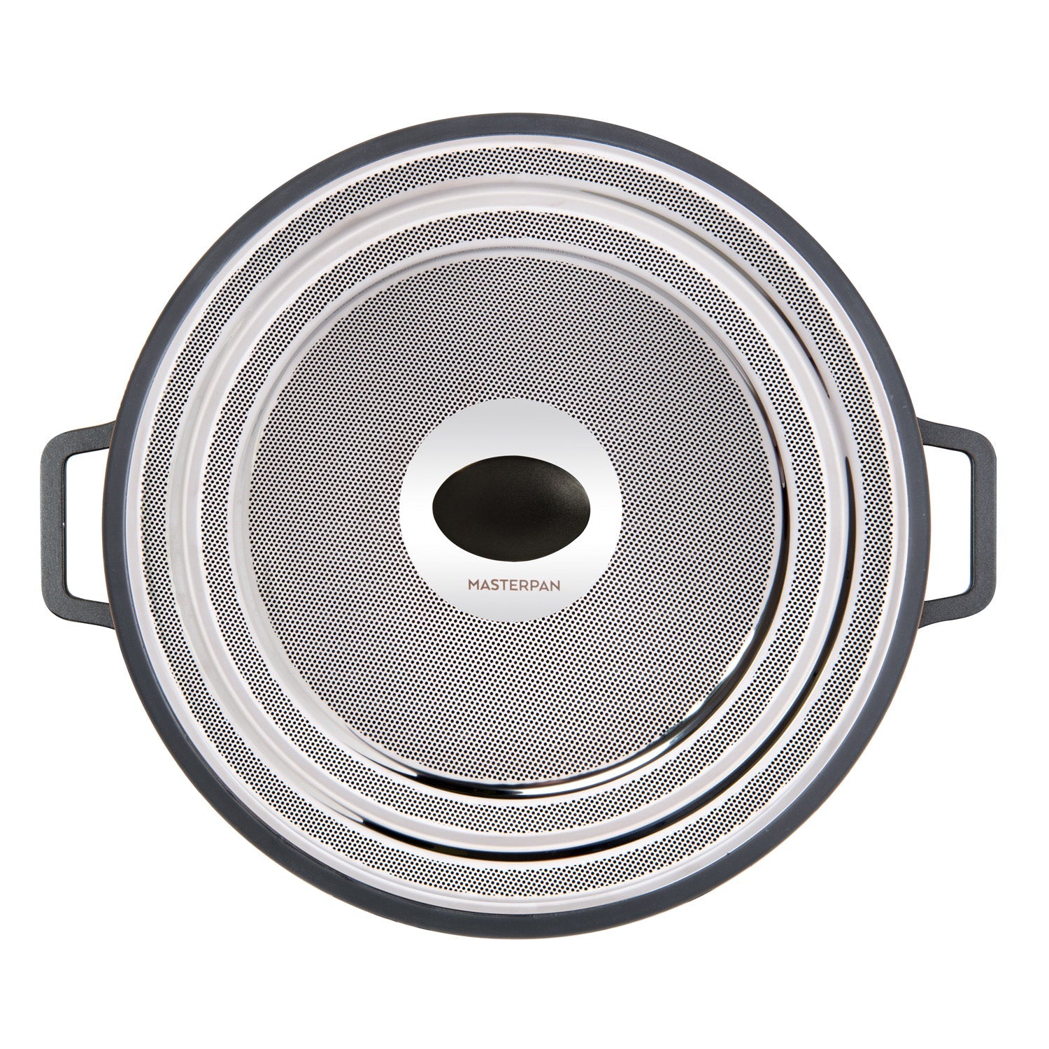 Introducing the one of a kind MASTERPAN Stovetop Oven Grill Pan with a 12" diameter. The only pan that has the features of an oven but can be used on a stovetop. Instead of waiting to heat up your oven and then baking your food for lengthy periods of time, use our stovetop oven to cook frozen foods and other foods you would put in the oven. Key Features of the Lid: * Stainless steel for longer lasting * Steam releasing, heat trapping lid has over 5000 laser etched holes that act as a splatter guard preventing hot oil splashing out, retain heat on the inside but releasing steam at the same time to avoid condensation on the inside. Creates the perfect oven-like feeling on the inside keeping fried food hot and crispy. * Lid can be used as a splatter guard for any other pot or pan between 8-12” as well. Works great for frozen foods without having to heat up a big oven just for frozen fish fingers or burgers. Ideal in re-creating an oven environment on camping trips and smaller homes with no ovens. 2 colors to choose from black or red.