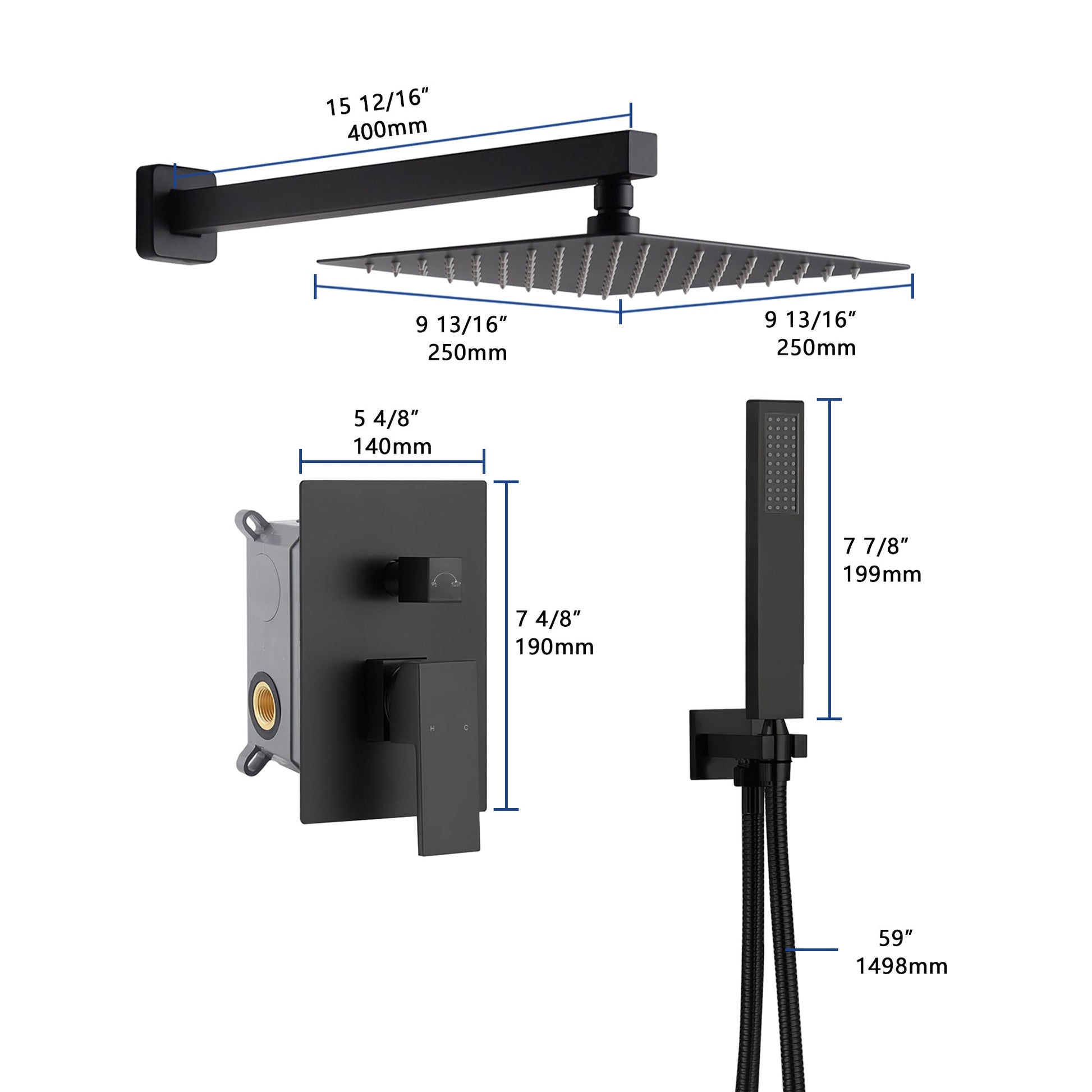 Matte Black Wall Mounted Rainfall Shower Faucet Dual Function with Pressure Balance Rough-In Valve