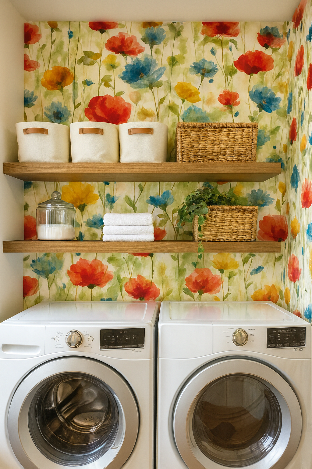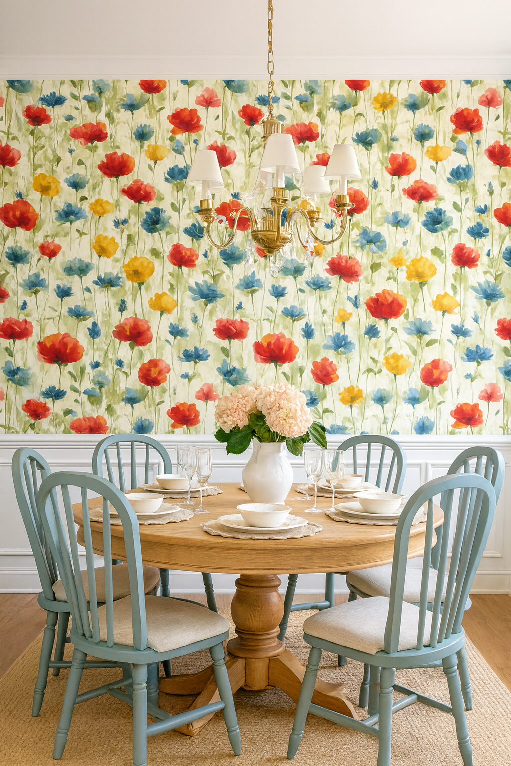 Meadow Waltz is a cheerful watercolor celebration of wildflowers—poppies, cornflowers, and buttercups bloom in red, yellow, orange, and blue on a sun-washed ivory field. The fluid strokes make this pattern feel hand-painted and joyful. Ideal for sunrooms, cheerful kitchens, or cottage-core bedrooms.
