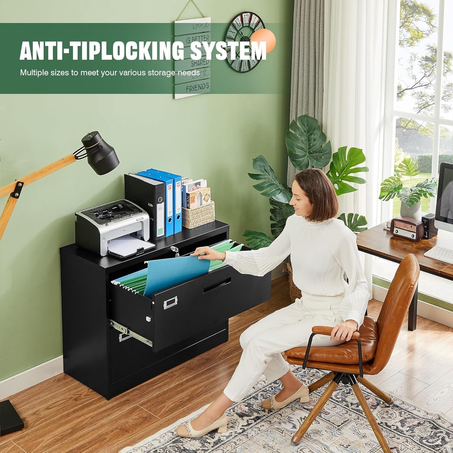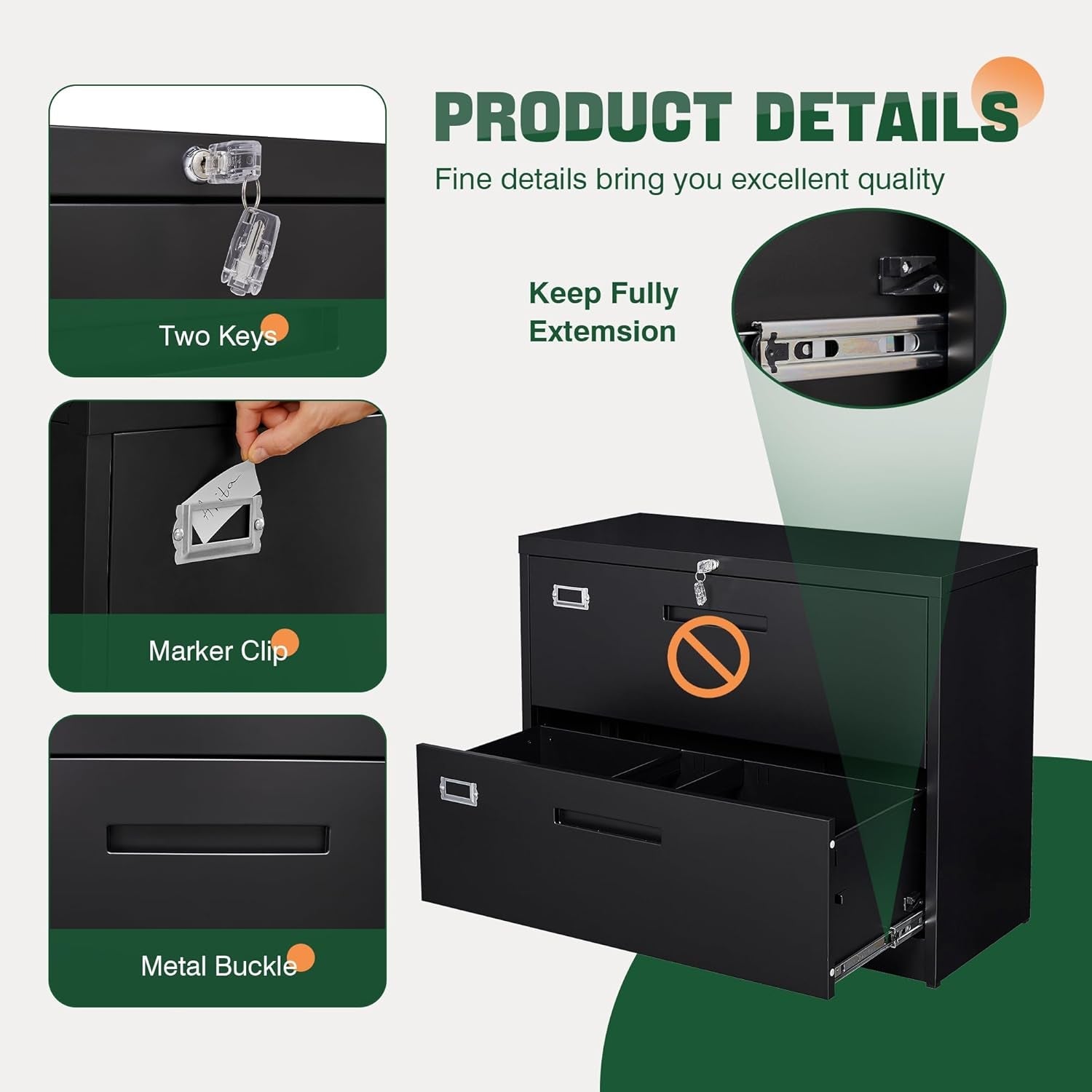 Metal Lateral File Cabinet With Lock 2 Drawer Black Steel