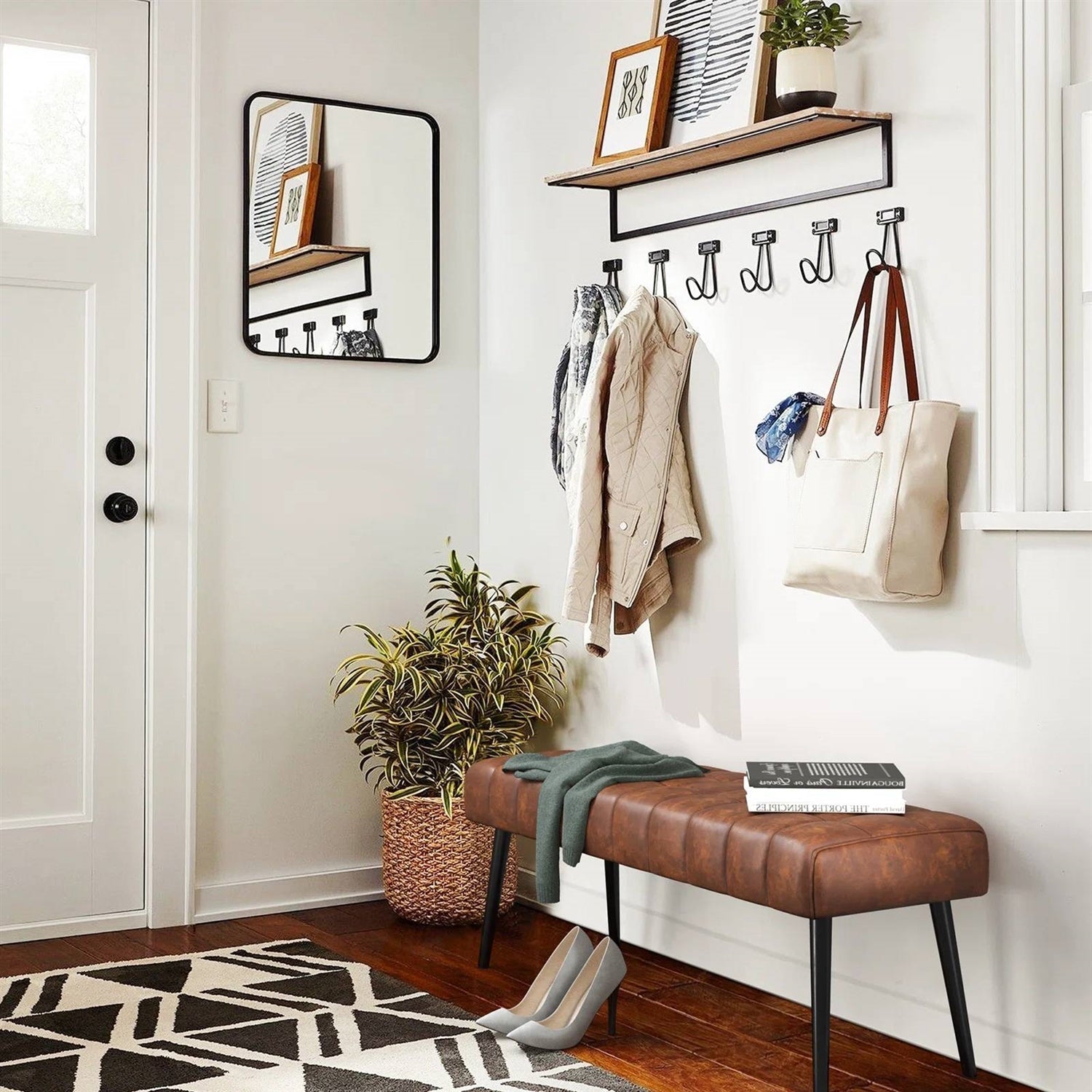 - This leather bench is made of PU leather, showing a classic home style. The solid wooden frame and metal feet ensure the bench's stability.