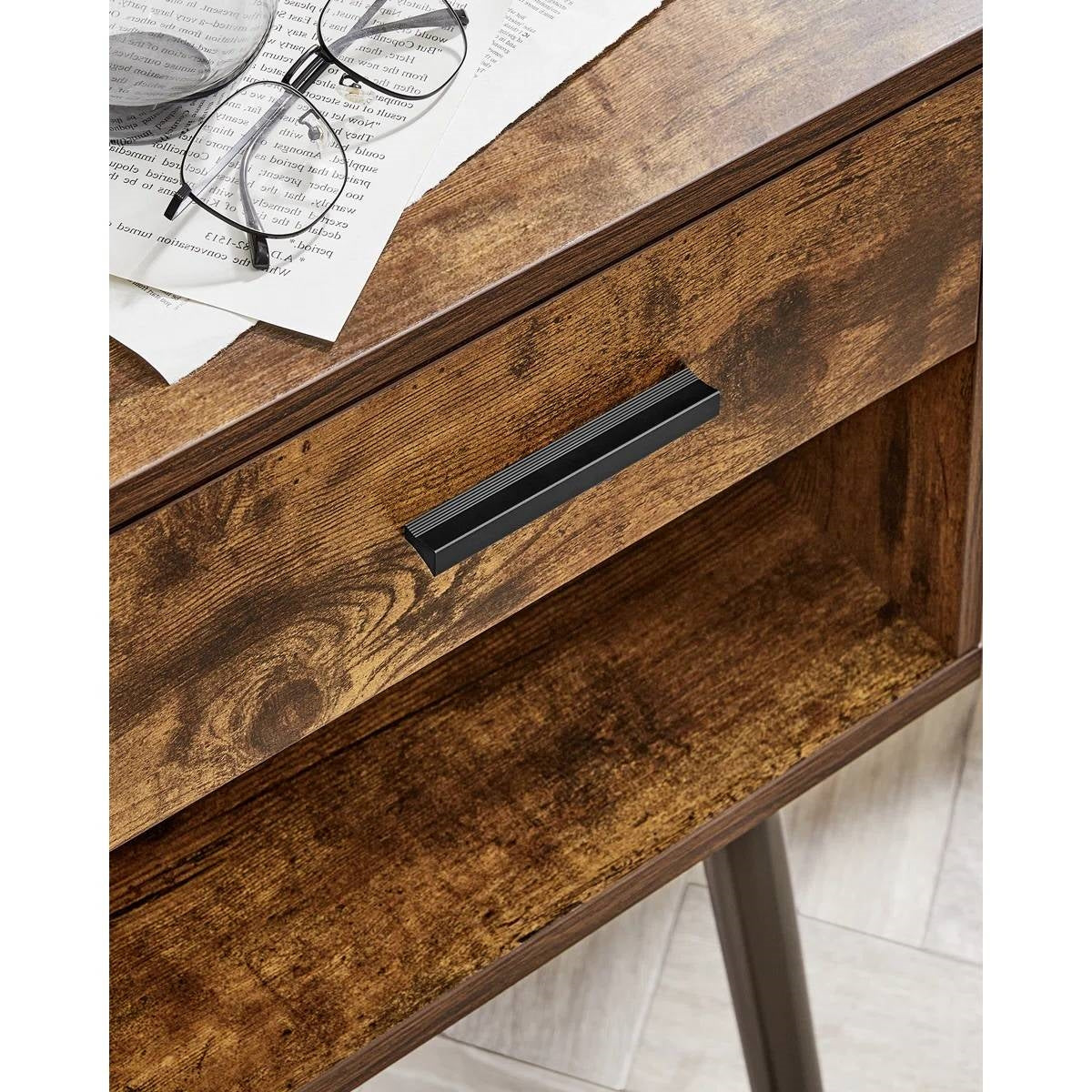 Add an elevated look to your bedroom with this Mid-Century Modern Farmhouse 1-Drawer Nightstand with Open Shelf that's full of mid-century modern charm. Crafted from solid and engineered wood, it rests on four angled, tapered dowel legs that emulate the iconic style. A weathered rustic brown finish contrasts with the black tone of the legs to round out the design. An upper drawer and a lower shelf provide plenty of room for all your bedtime necessities. At 15.75" wide, this bedside table is ideal for space-conscious locations around your home.