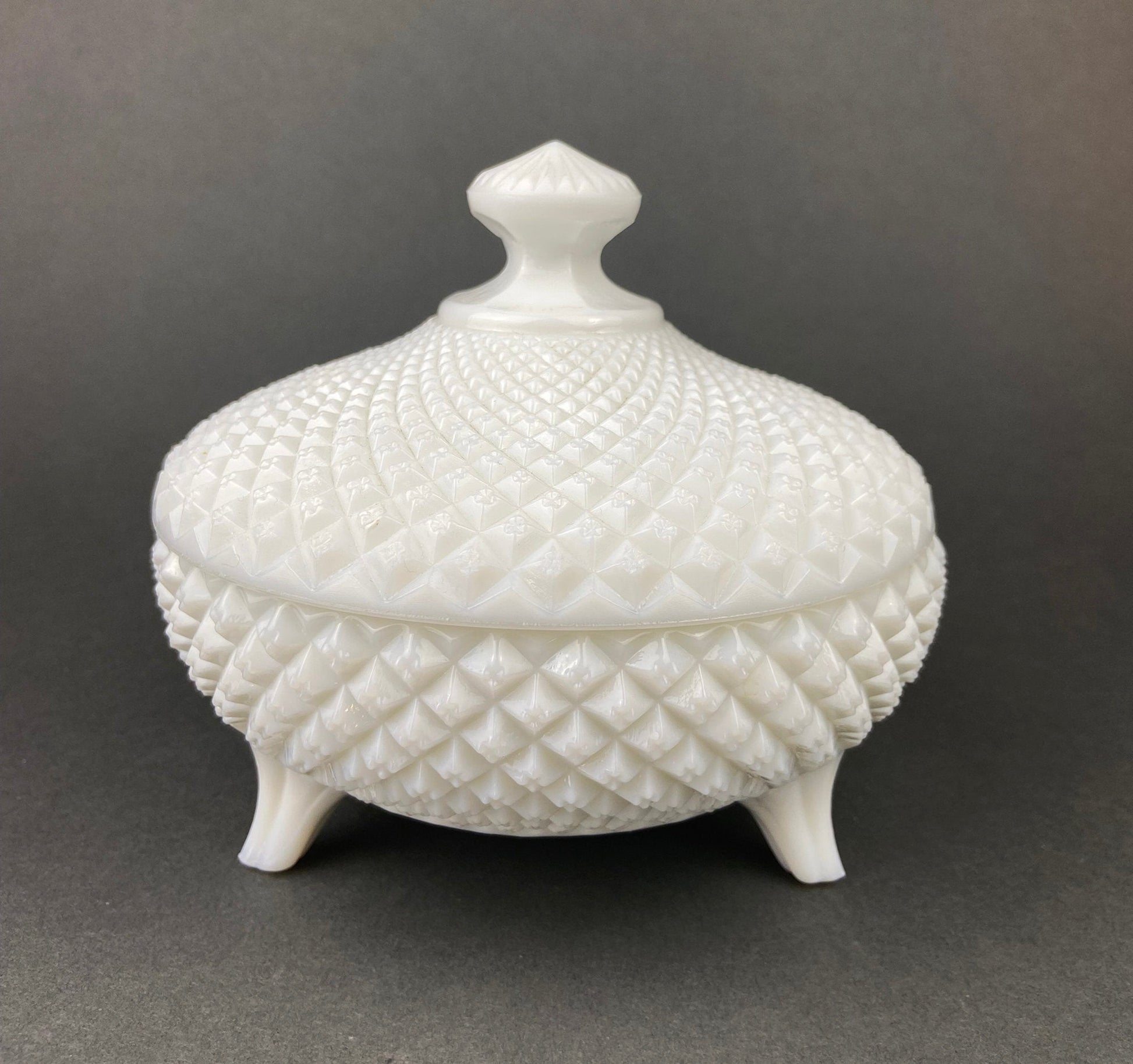 Milk Glass Salt and Pepper Shakers. Grape Vine Motif. Please note minor scretch and indent on one of the shakers.