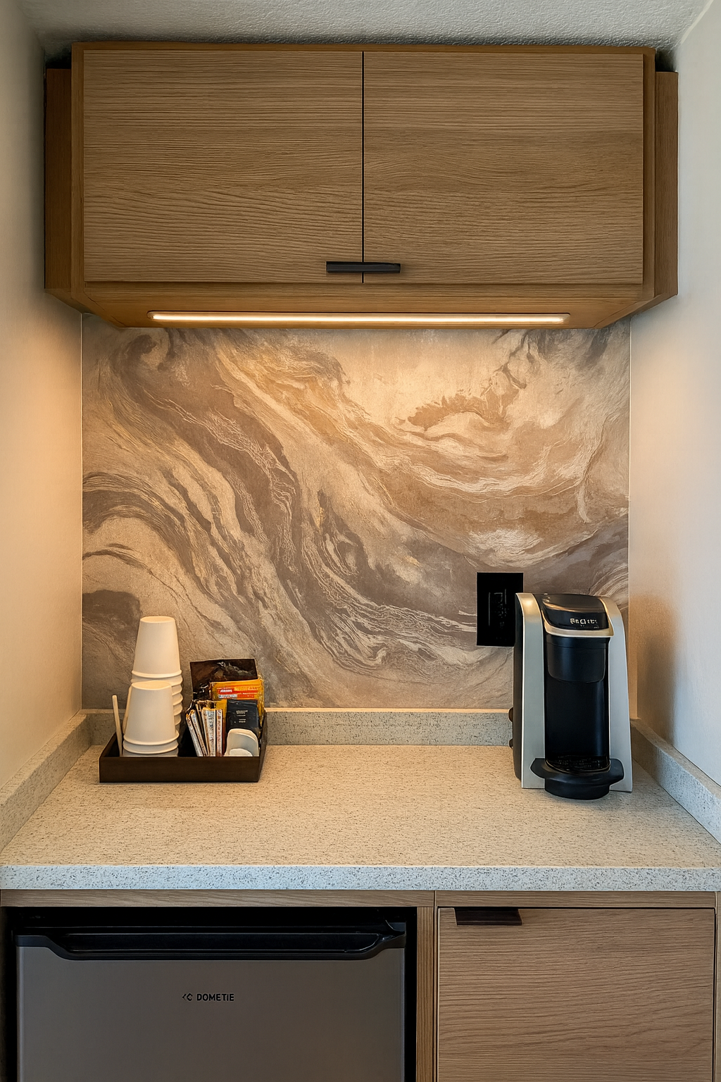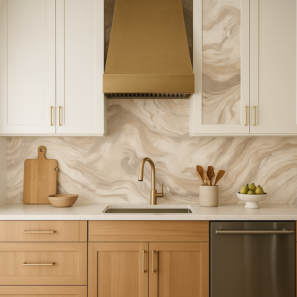 Flowing with the soft veining of natural stone, this abstract marble pattern glides in creamy taupes, warm sands, and pearly whites. Gold and silver undertones trace through the strata like echoes of fossilized motion, evoking both luxury and earthiness in equal measure.