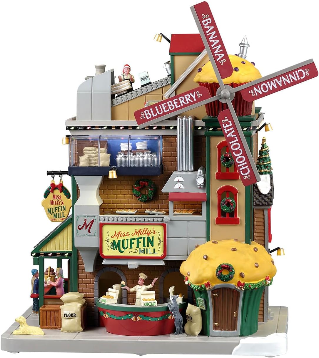 Indulge your senses and experience the festive charm of "Miss Milly's Muffin Mill," a delightful destination that fills the air with the mouthwatering aroma of freshly baked muffins! This enchanting building captures the essence of a bustling bakery, where the promise of delicious treats like blueberry, chocolate, and banana muffins beckons visitors to explore. Bursting with character, this festive shop showcases vibrant decorations, cheerful bakers hard at work, and a windmill that spins with joy, creating a lively atmosphere that everyone in the Christmas Village loves.