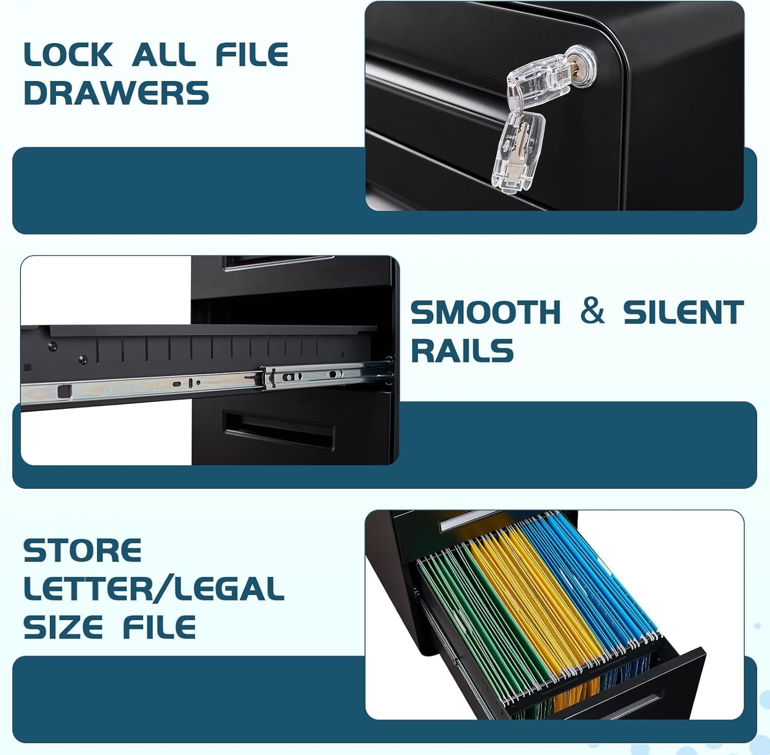 - Three-drawer design with adjustable hanging file bars and removable pencil trays keep Letter, Legal, and A4 files—plus small office essentials—perfectly organized.