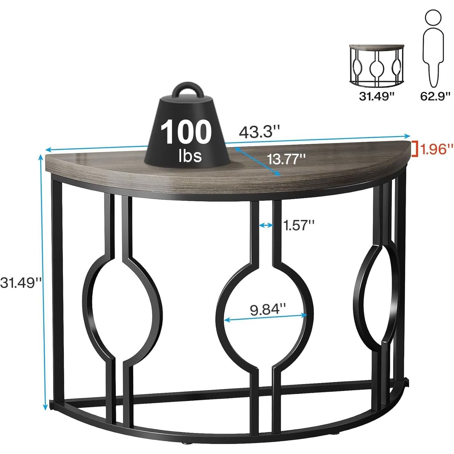 Admire this Modern 43-inch Half Moon Accent Sofa Table with Grey Wood Top Black Frame with a unique curved design accented by chic geometrical frames. Its dark distressed finish lends a retro-industrial charm, making this semi-circle table a perfect statement piece. Sized at 31.5''H x 43.3''L x 13.8''D, this slim accent table can fit in your foyer, hallway, or living room. It serves as a sofa couch table for lamps and books, a beautiful entryway table to hang a mirror above, or an exquisite end table for coffee. At 1.96” thickness, the retro textured manufactured wood displays an abstract texture with a smooth surface, perfect for display from sculptures to decorative vases. Maximum weight limit: 100 lbs. Made from durable wood, the table is scratch, stain-resistant and waterproof. The metal frame is powder-coated for wear and rust resistance. Adjustable foot pads ensure stability and prevent floor scratching. All required tools are included. Follow the detailed instructions to assemble this chic wood half-moon entry table in just 15 minutes. We also offer a 12-month guarantee and friendly customer service for a worry-free purchase.