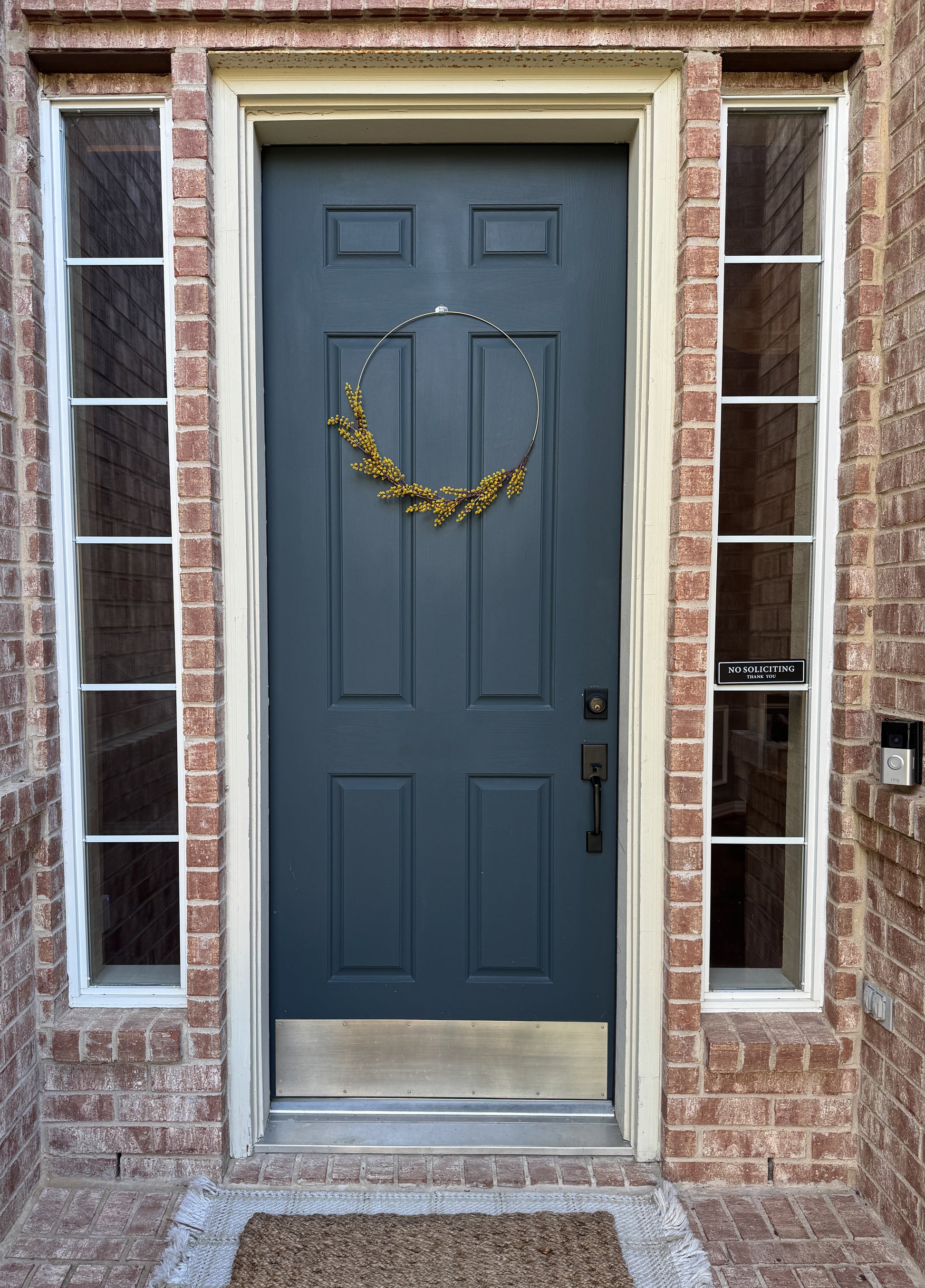 Welcome your family and friends into your home with this modern fall hoop wreath. This minimalistic & simple autumn hoop wreath has been handcrafted on a matte gold hoop and is trimmed with golden-yellow mimosa sprays. Gold wire adds another modern touch to this modern front door décor.