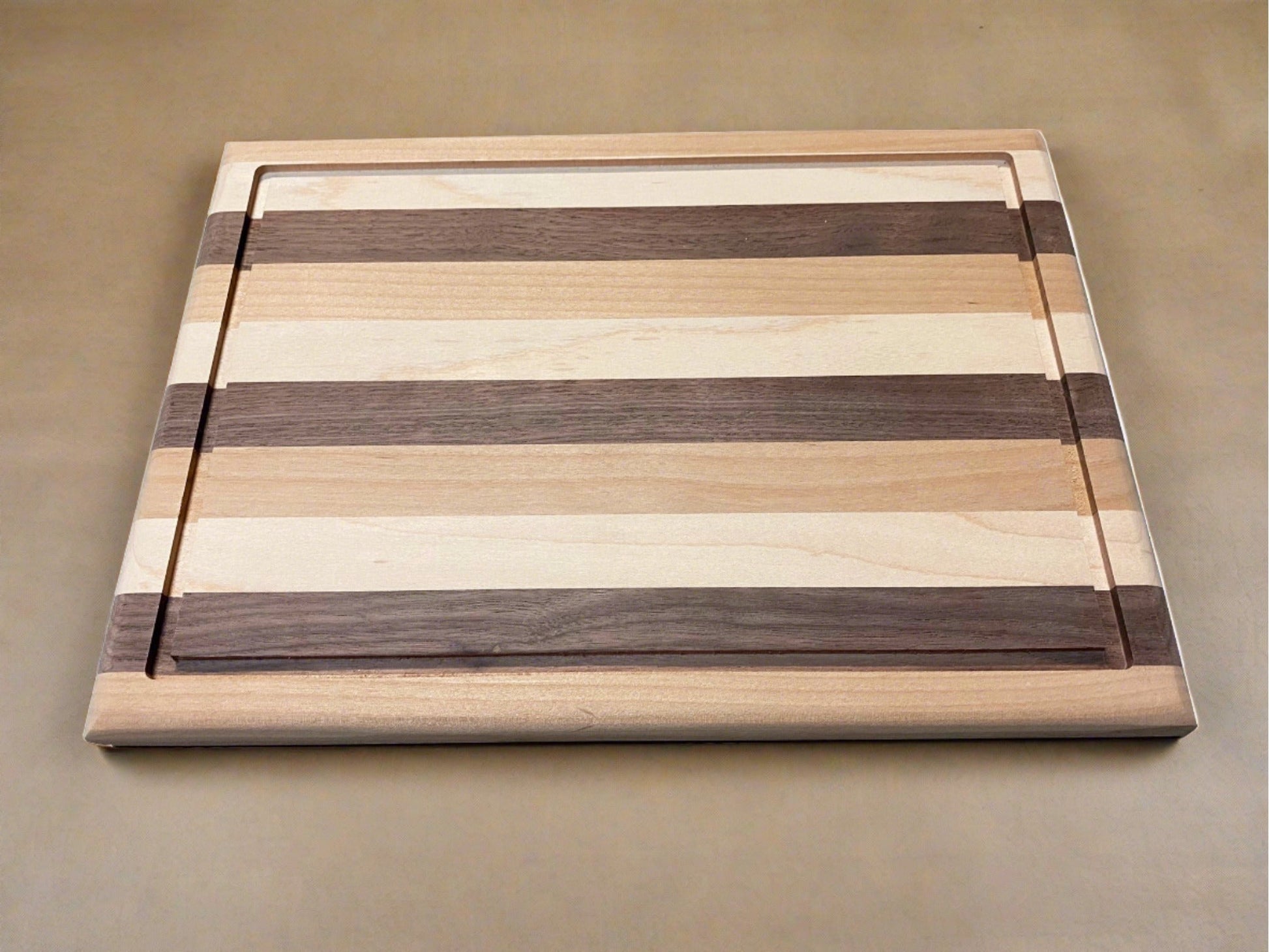 Designed with a modern strip pattern of Alder, Walnut and Hard Maple wood together. Each board is sanded to a smooth to the touch finish and inspected by hand to ensure there are no splinters or rough areas that could invite bacteria into your cooking surface. It’s designed with a carved juice groove all around the edges to catch any runaway liquids. Perfect for carving meats, slicing fruits, chopping vegetables, dicing herbs, mincing and more while keeping a clean kitchen. It can even be used as a unique plate to enhance the experience of any meal. Unfinished natural wood. Our customers can choose from any seasoning oil or finishing wax they prefer. When finished, the board carries an attractive deep rich color and natural grain patterns, making it a beautiful piece of home decor to go with its functionality.
